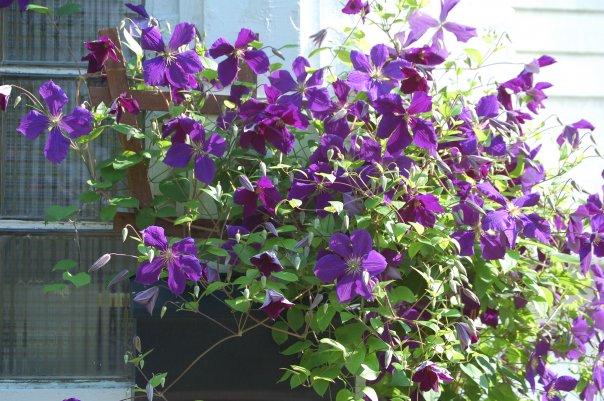 Finally, there’s the entrance to the front door. On the steps and along the walkway to the brick stoop we have numerous containers. Three are filled with dwarf “blue chip” butterfly bush. Other containers have a mix of summer annuals, usually Lantana, geraniums, million bells, etc. A narrow triangle of soil between the walk and the driveway has a 3′ rose, “Cassie”, with small semi-double white flowers. There’s also a New Jersey Tea, and a groundcover of Vinca. Further back, along the west wall, there are cup plants and Clematis jackmanii.