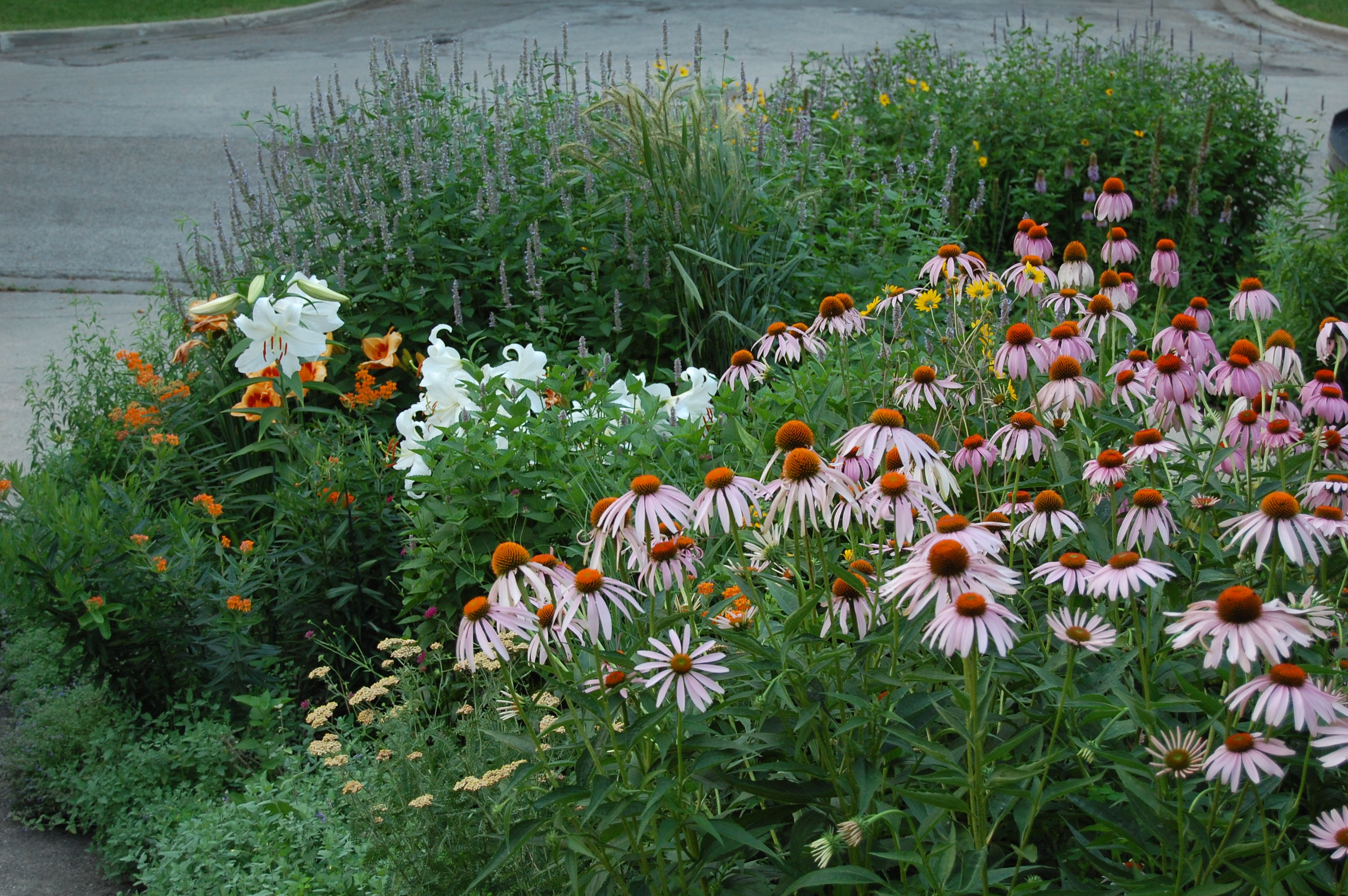 Then there’s a taller layer consisting of “Casa Blanca” oriental lilies, wild bergamot, the perennial western sunflower, blue wild indigo (Baptisia australis), and the aforementioned purple coneflowers, mixed with switchgrass and silky wild rye.