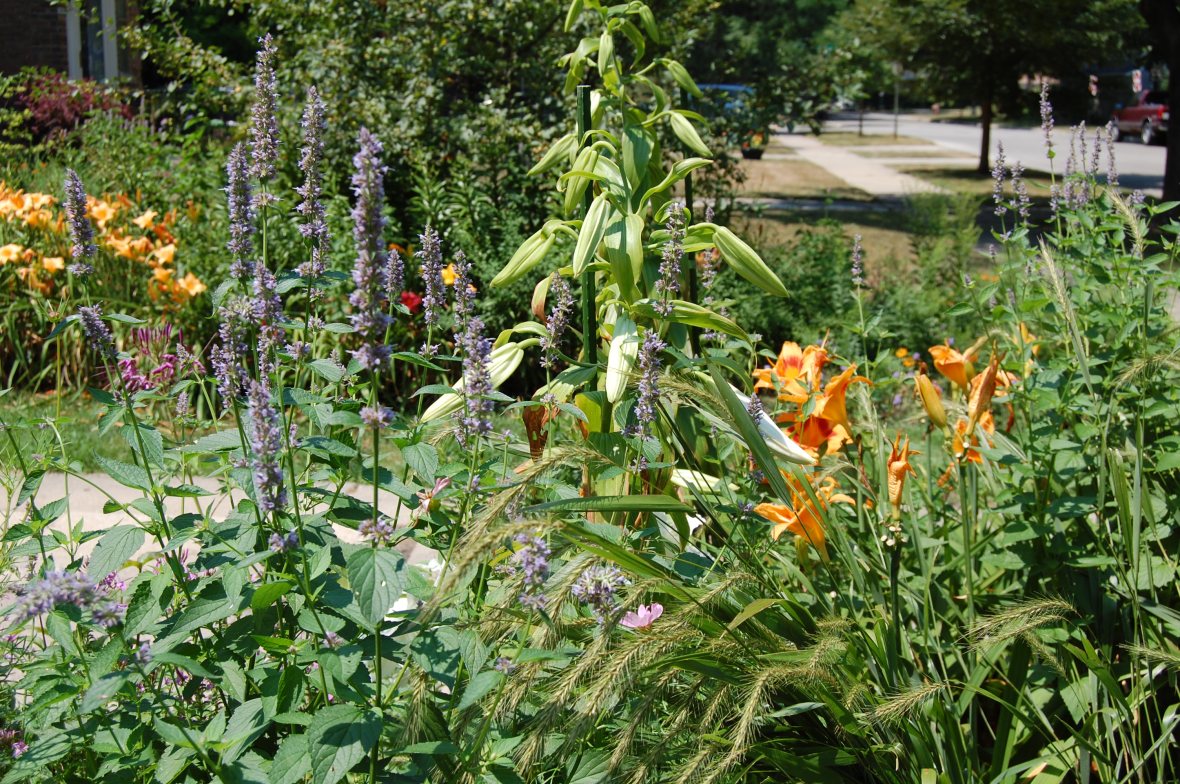 Anise hyssop with Oriental lilly buds and daylilies.