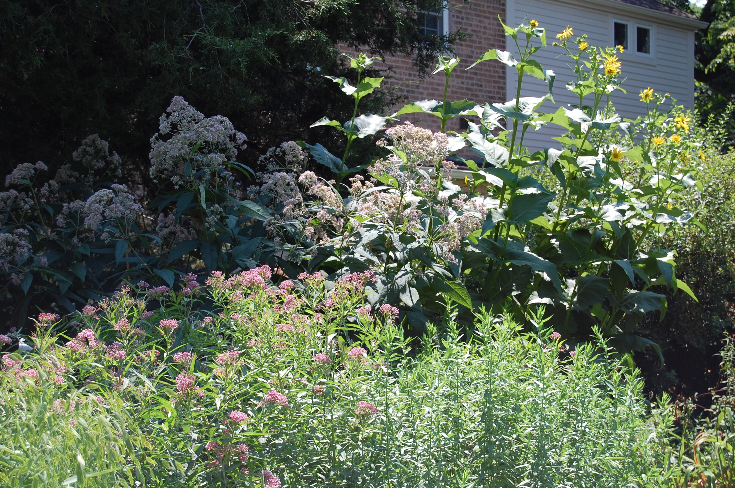 Godzilla and Megalon! I mean Cup Plant and Sweet Joe Pye Weed, standing tall behind Swamp Milkweed and New England Aster.