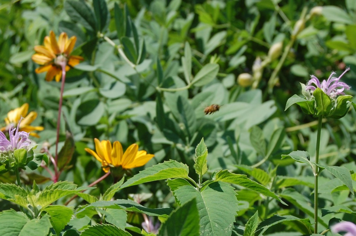 Bee in flight among wild bergamot and false sunflower.