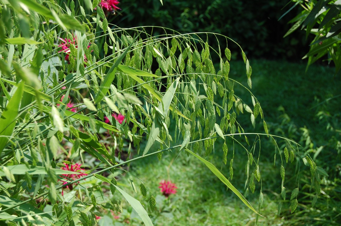 Chasmanthium latifolium, Northern Sea Oats. A great grass that grows in sun or shade. In my yard grows a little too tall and tends to get floppy.