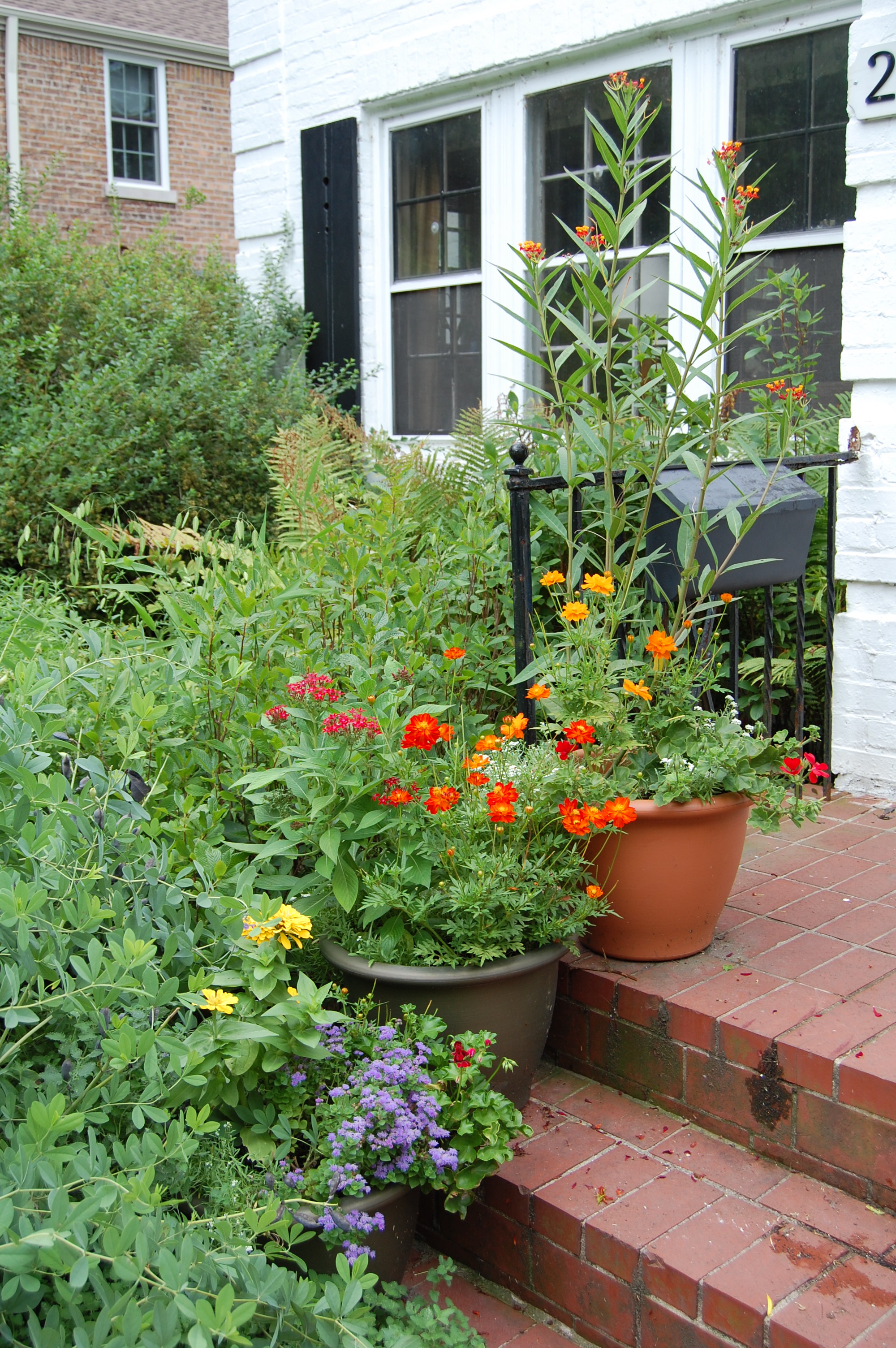 Your containers look great! You’ve balanced the colors really well. The past two years I’ve grown Tropical Milkweed also and have been pretty disappointed. It hasn’t seemed to attract many insects, let alone Monarchs. Aphids love it though. Container gardening for me this year has been about herbs, particulary the aggessive ones that I wouldn’t dare put in the ground like mints and lemon balm. I love having them close to the door so I can grab some while I’m cooking or mixing drinks.