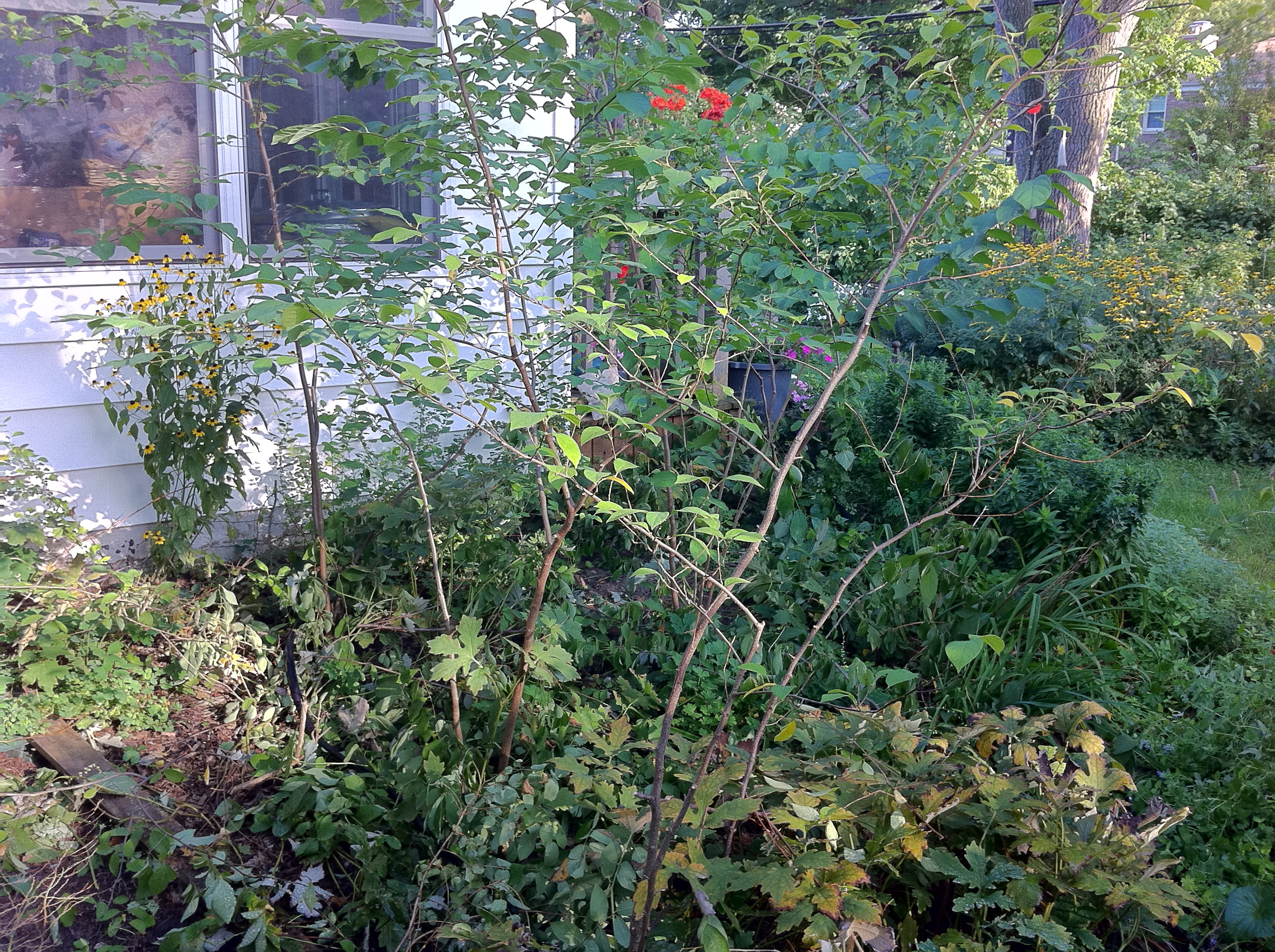 - Shrubz 2 Treez. I may have mentioned this before, but Judy really dislikes shrubs. She’s fine with small trees, but despises shrubiness. Me, I like shrubs. But I was very taken with a photo I found from the website of the Ladybird Johnson Wildflower Center in which Spicebush (Lindera benzoin) had been pruned into small trees. This allows for more vigorous growth by the perennials at the base of the shrubs. The birds had just stripped my Spicebush of berries – within days of their ripening. So I took my trusty Fiskars bypass pruner and went to work. Then I read from Donna at GWGT how you weren’t supposed to do heavy pruning until late fall or winter – earlier pruning encourages tender growth that will be killed by frost. Now I’ll just have to wait and see if my eager improvements will cause any damage. This is my problem as a gardener: I lack patience, when I am seized by an idea I have to act RIGHT NOW.