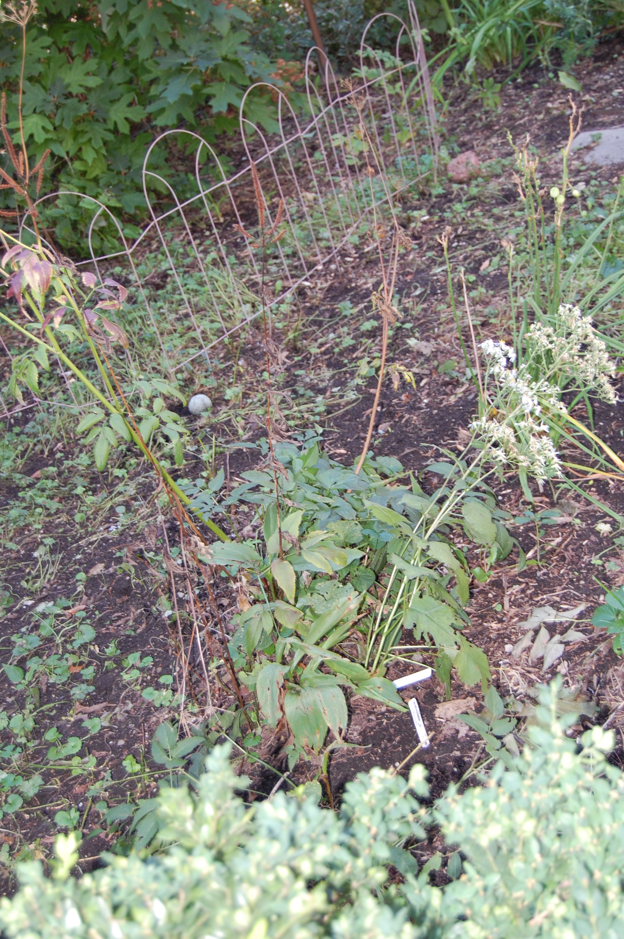 The southern arm lies along a chain link fence (marking the border with the neighbors). It gets some morning sun but is mostly shady and the soil is moist. There’s a golden alexander (Zizia aurea) and an oak leaf hydrangea in the southwest corner. Otherwise this area is pretty much overrun by Creeping Buttercup (Ranuculus repens).