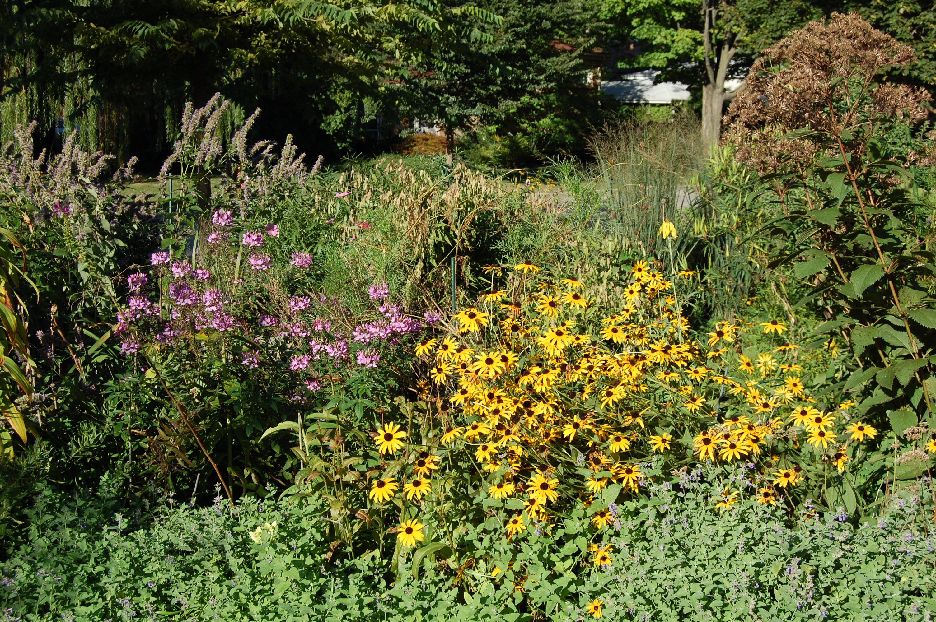 Most of the color coming from the raised bed along the walk to the front door comes from Black Eyed Susan (Rudbeckia fulgida) and Spider flower (Cleome ‘Senorita Rosalita’).
