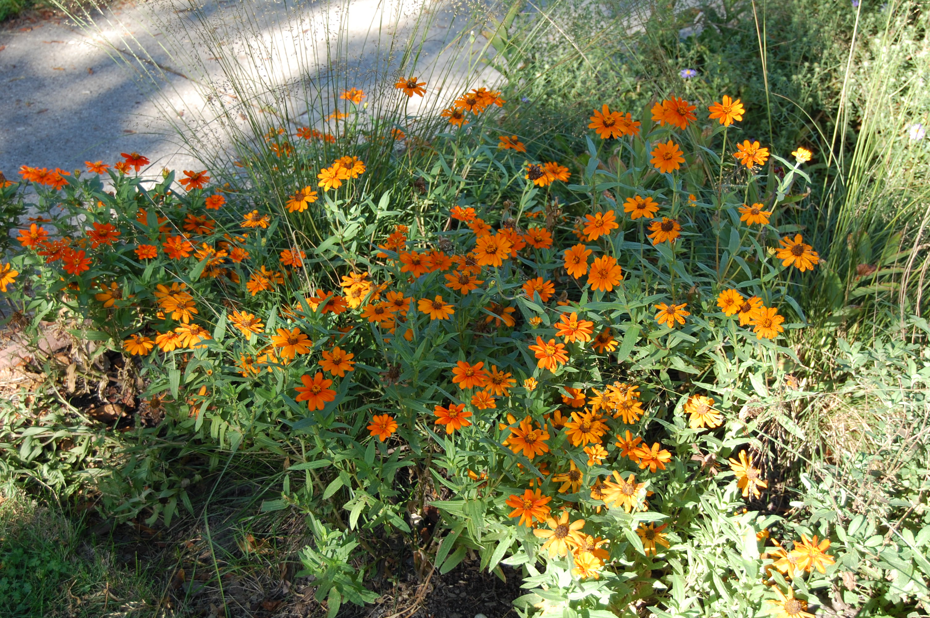 Now let’s amble around to the front yard, past the vegetable and herb bed. First we see the orange  ‘Profusion’ Zinnias interplanted with Prairie Dropseed (Sporobolus heterolepsus).