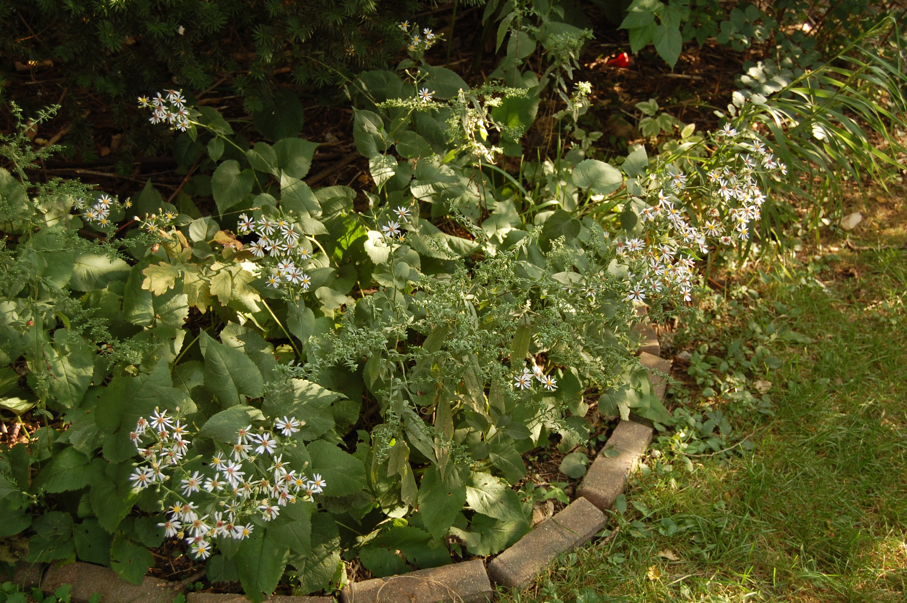 White Woodland Aster (Eurybia divariticus). I’ve read that this aster spreads aggressively, but that has not been my experience. In fact, I planted it years ago in a moist, shady spot and it gradually disappeared. I’ve got it growing now in dry shade, and we’ll see how it does. A low-growing aster with white flowers.