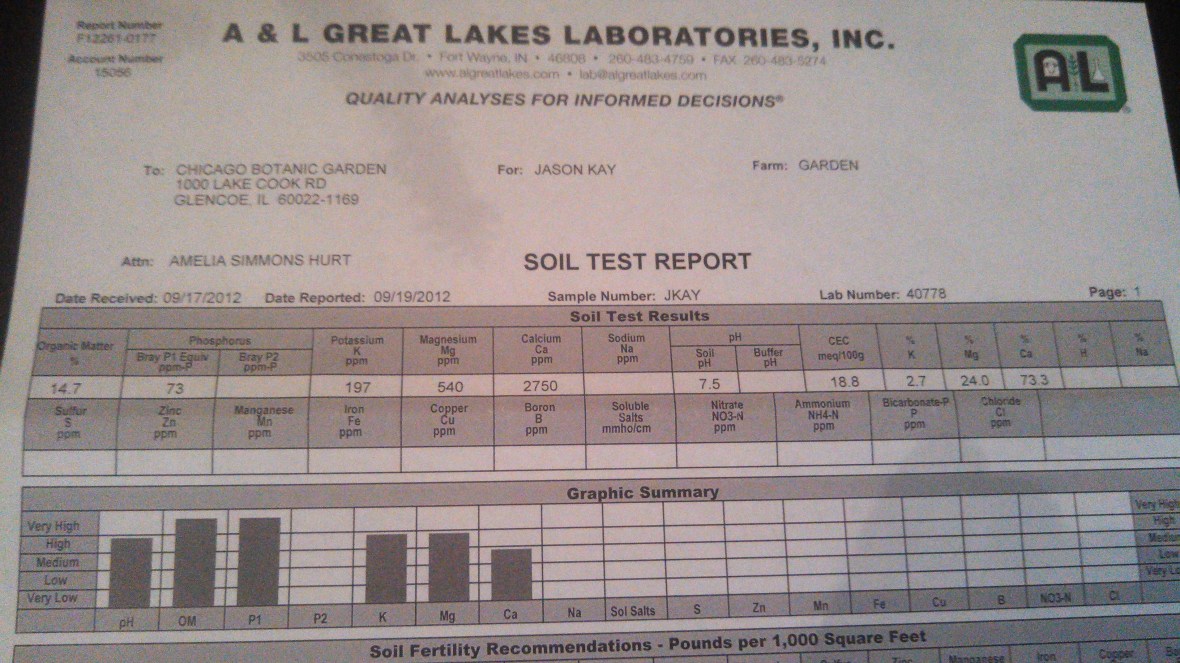 So I’ve been taking a class called “Soil Basics” at the Chicago Botanic Garden. The instructor is Ellen Phillips, who has many years experience as a soil scientist in the US and overseas. (She’s an excellent teacher, and I recommend the class for those of you in the area.) As part of the class we each brought in a soil sample to be tested.  My sample was from the raised flower bed along the path to the front door. I’ve often suspected that the soil in this bed is actually too rich, because plants tend to grow like gangbusters.