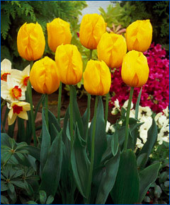 Combined tulip ‘Flair’ (red and yellow, early, 14″) with ‘Bellona’ (yellow, early, 14″).