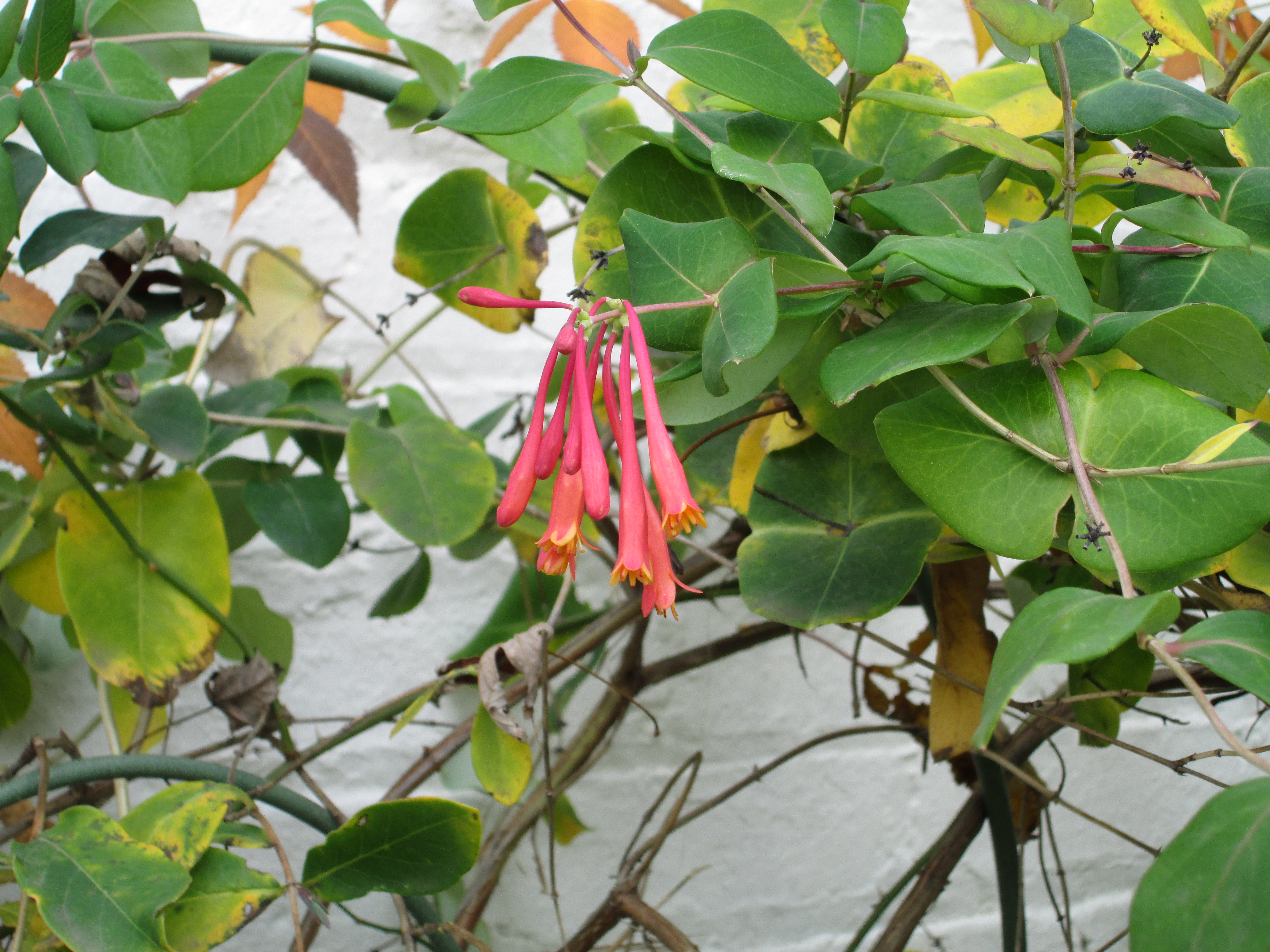Incredibly, there are still a few flowers blooming. The trumpet honeysuckle (Lonicera sempervirens) is having a last flush of flowers.