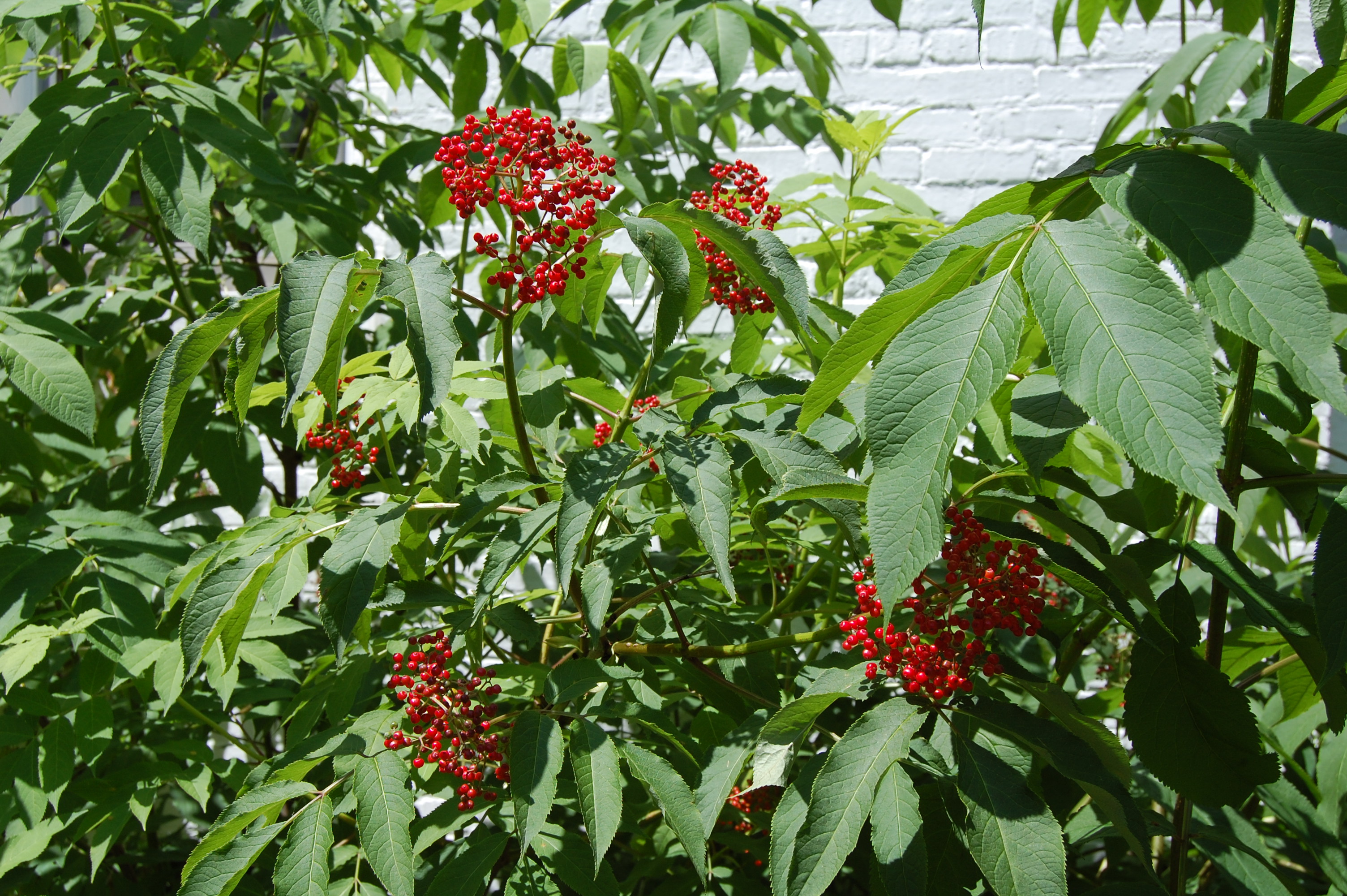 5. Red Elderberry (Sambucus racemosa L.). I suppose it is a bit weedy, but I like it anyway. The pyramid-shaped cream flower clusters and glowing red berries are gorgeous. Birds love the berries, but they are toxic to people.