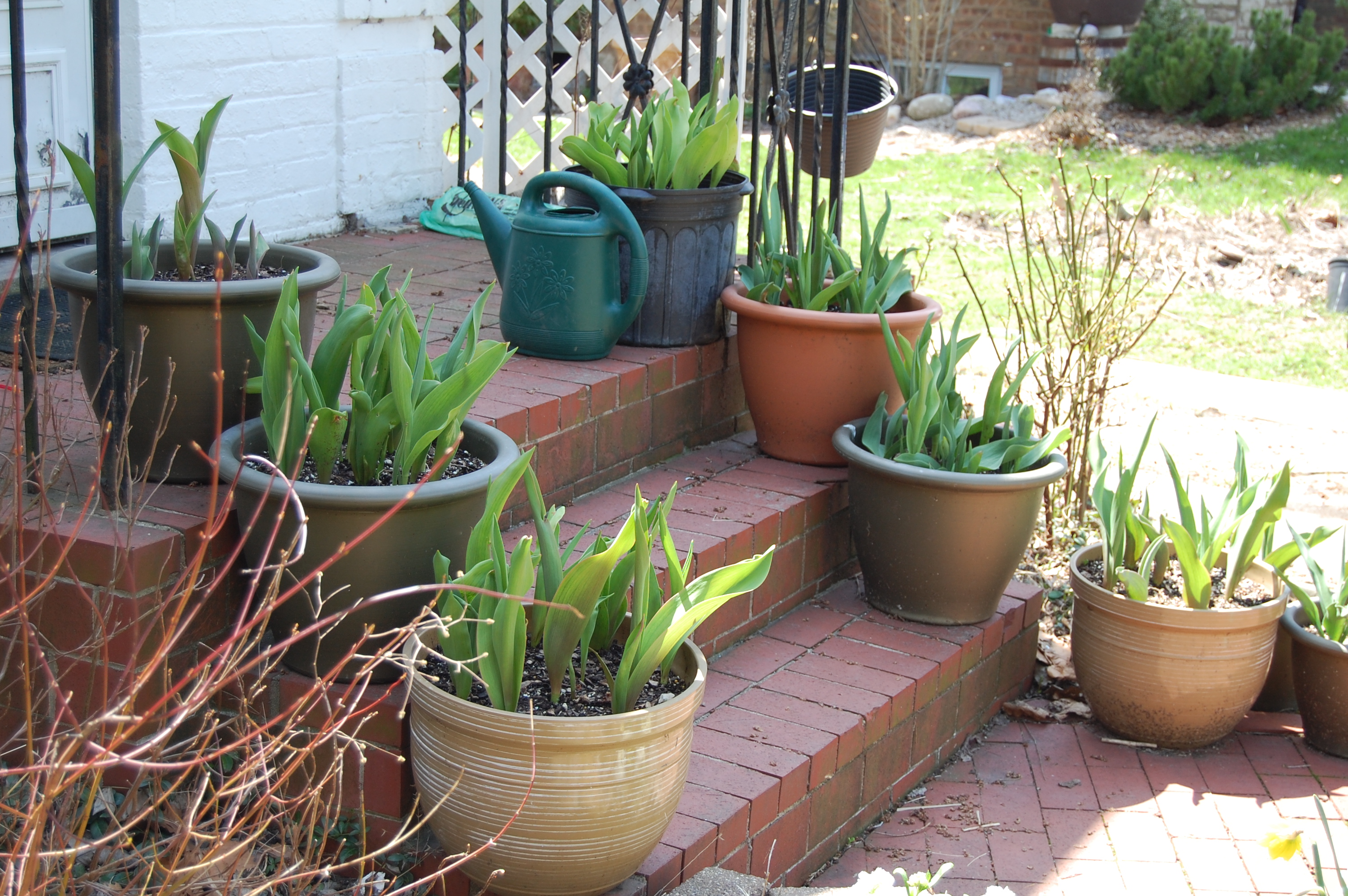 By the way, here’s a picture of the tulips in containers on the front steps. Some already have their flower buds.