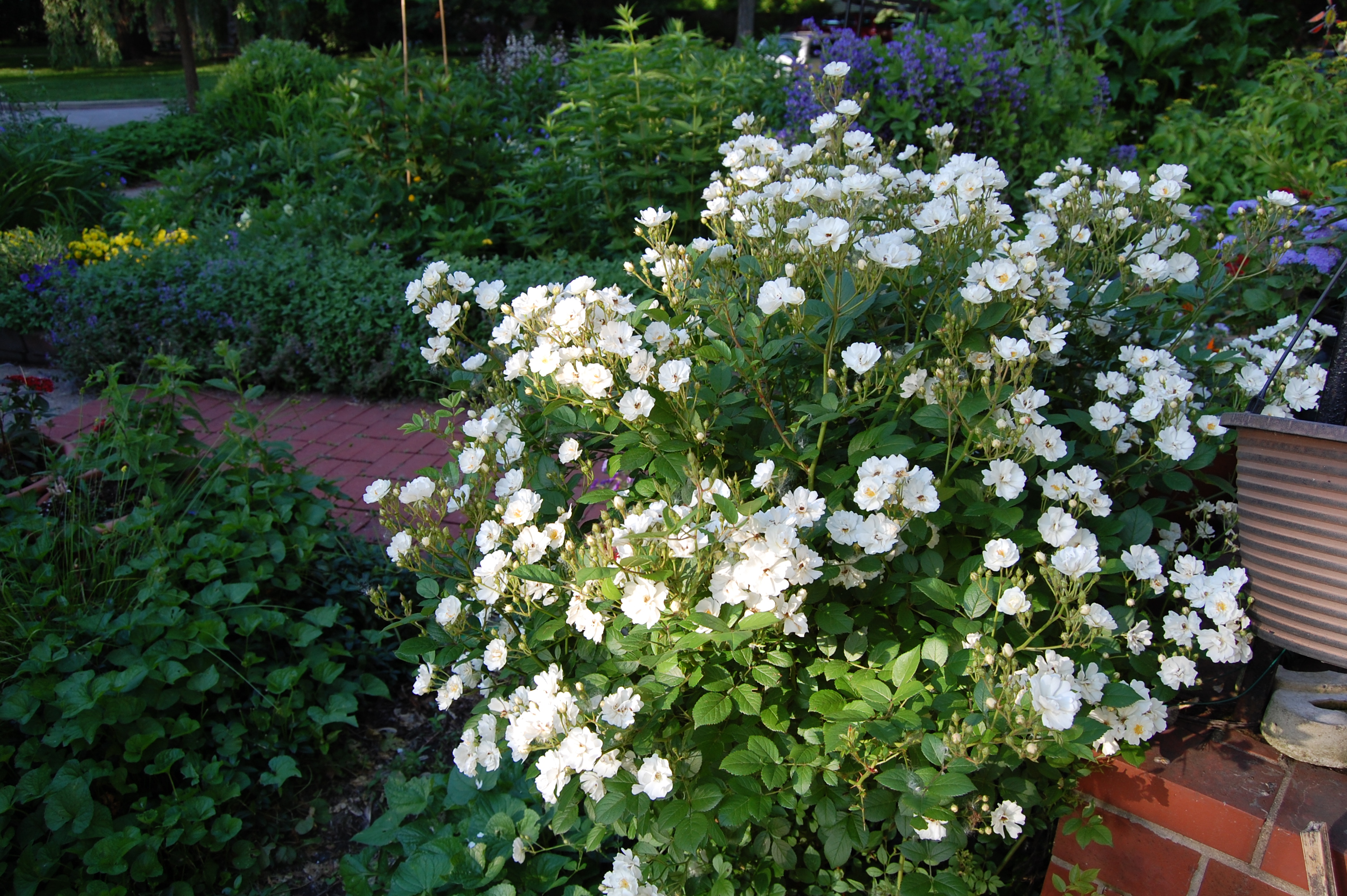 Sweet, sweet ‘Cassie’ is blooming her heart out with those adorable little white flowers. Only thing that bothers me is: why did I plant a white rose in front of a house painted white? Too late now, though, I like ‘Cassie’ too much to risk moving her.