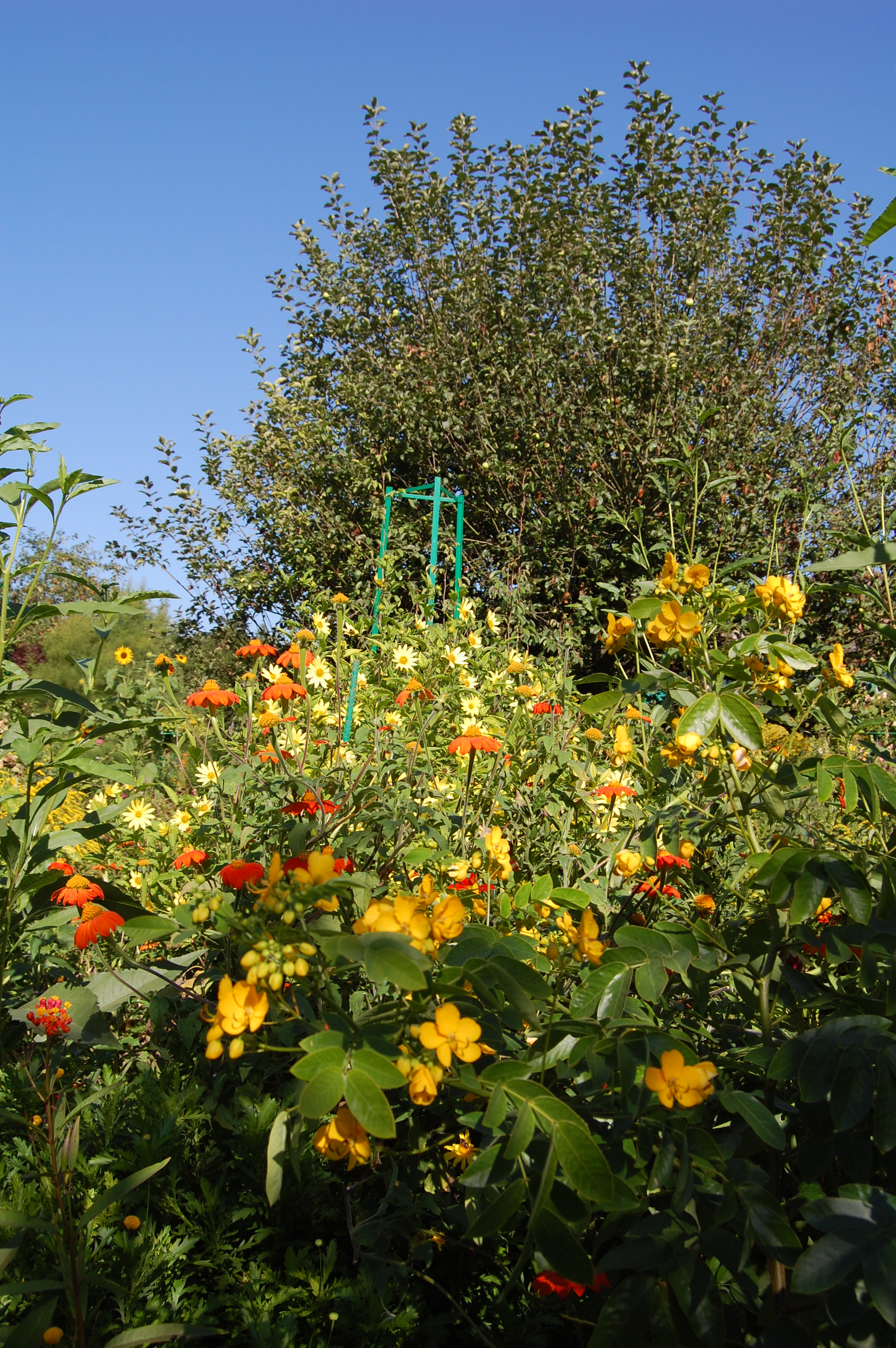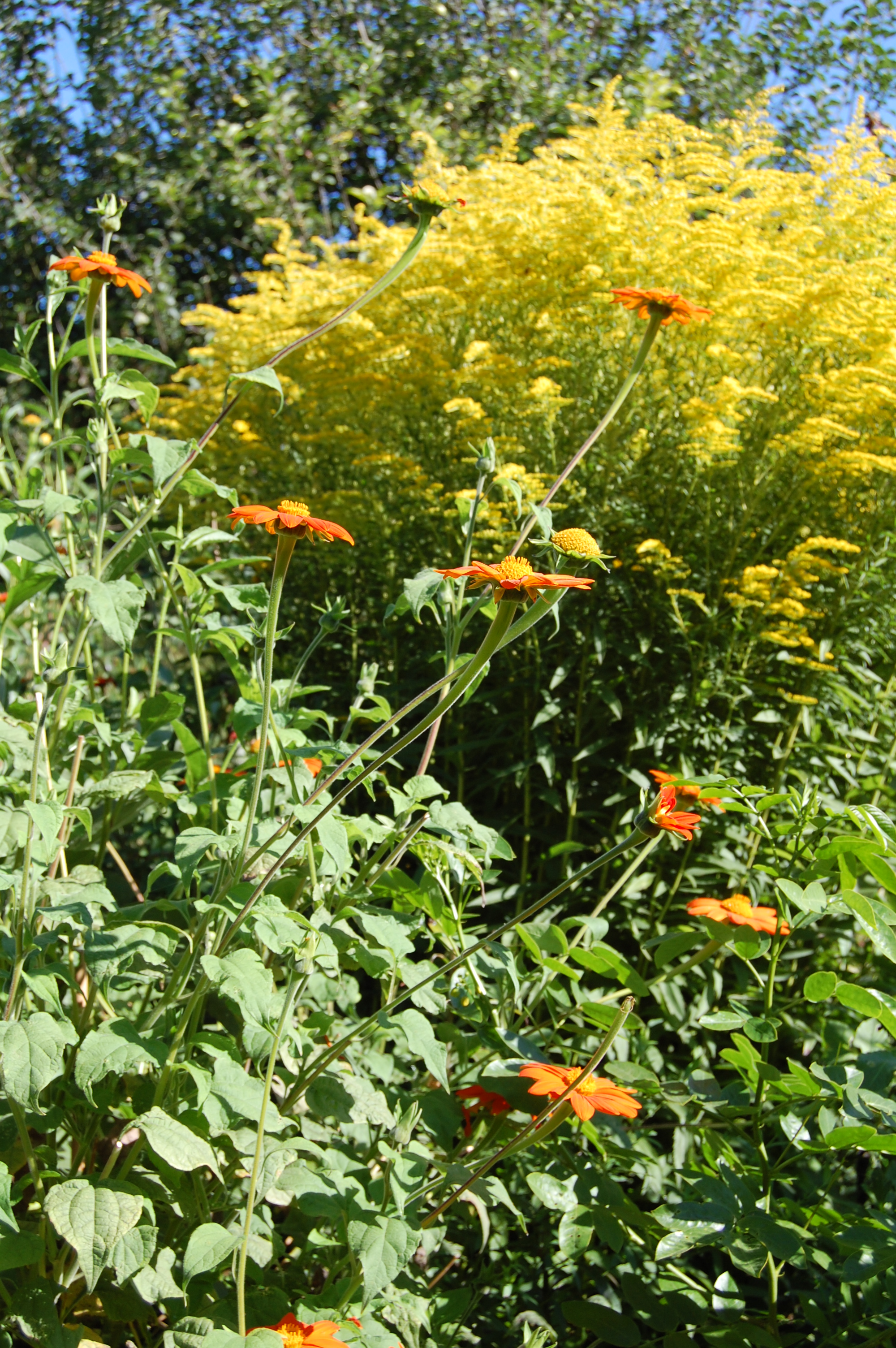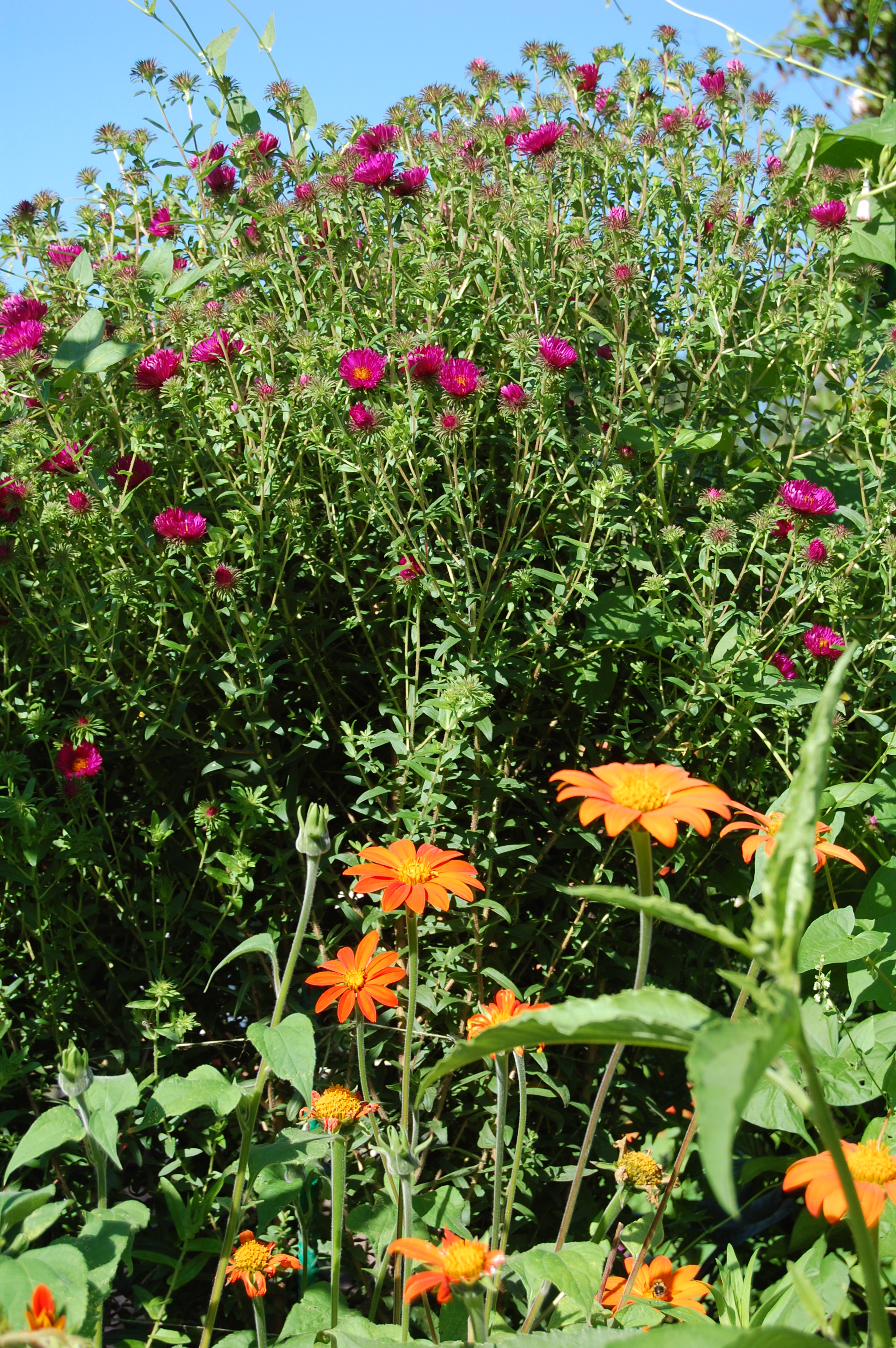 The New England Aster also provides height, but adds cooler blue and purple blooms. The Tithonias contrast nicely with these purple Asters, but are in harmony with the yellow sunflowers and goldenrods.