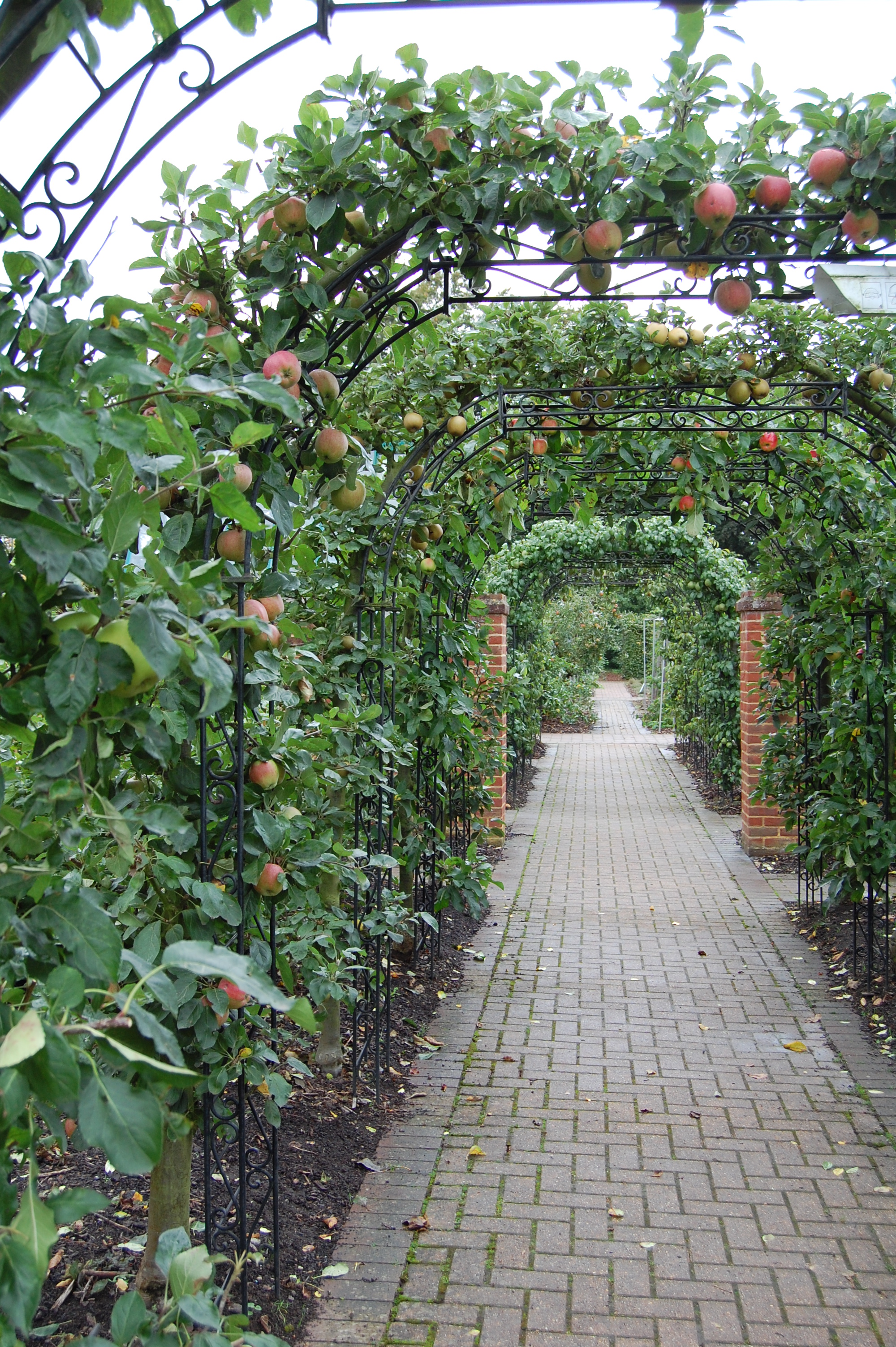 People do the most amazing things with apple trees. At Giverny they are trained to make living fences. Here they are trained up arbors, which I like even better. This is from the Fruit Demonstration Garden.