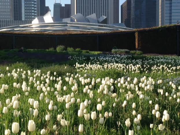 I’m really impressed with the green spaces in Chicago; this and the botanic garden are both fantastic. I also loved the High Line in New York, urban planting at its most exciting. I think some of the white tulips might be White Dream.