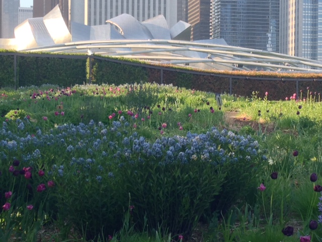 There were still plenty of late tulips blooming. The white tulips are especially striking. I think these are ‘Maureen’, ‘Ivory Floradale’, and ‘Spring Green’. As always, it’s the urban setting just as much as the plant palette that makes this garden so exciting. That’s the Pritzker Pavilion behind the hedge.