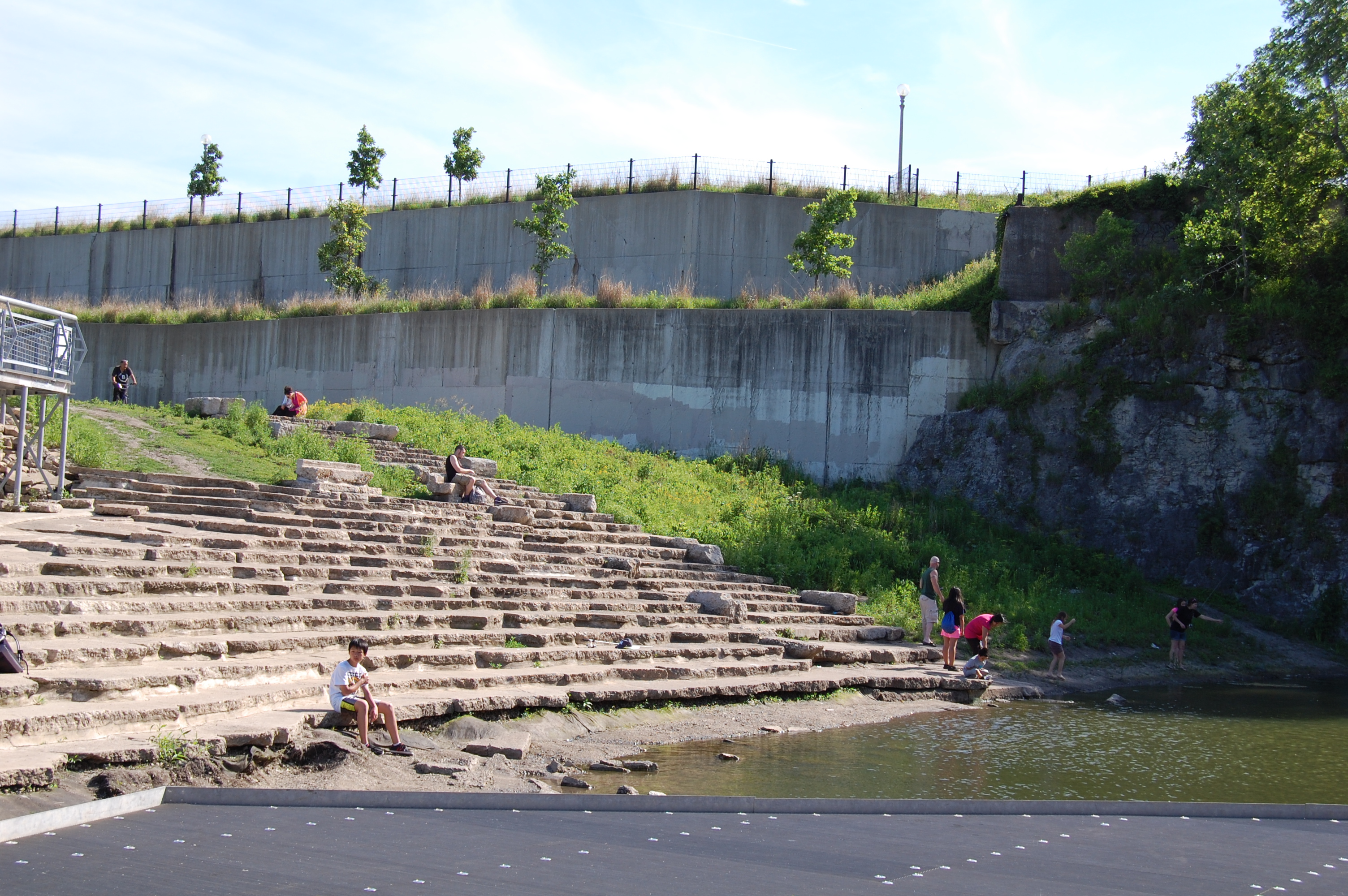 You enter from busy Halsted Street, coming to a fountain that recalls the cranes that were used in the old quarry. All the water that falls on Palmisano Park stays in the park, and water circulates from the pond to the fountain and back.
