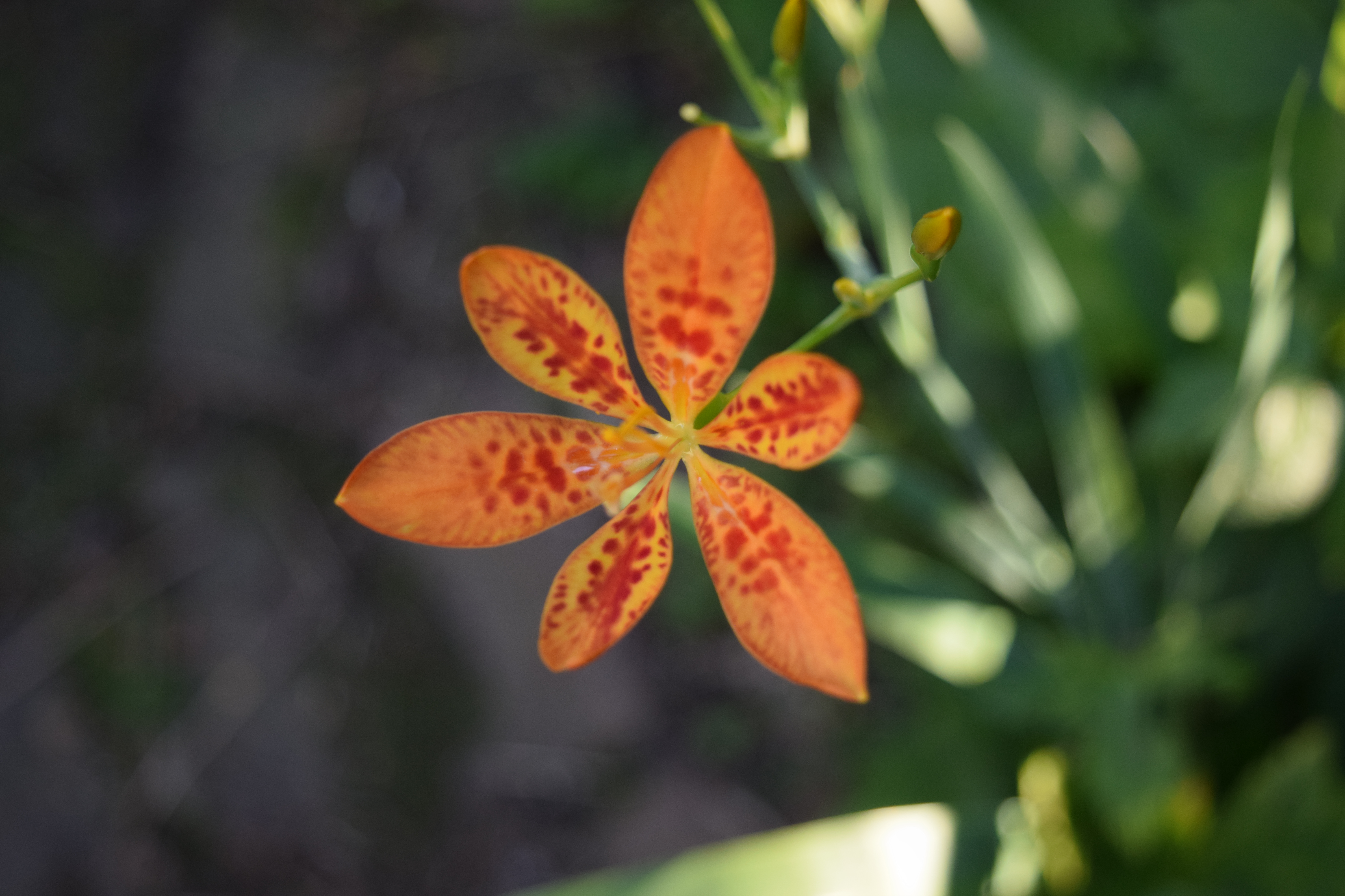 Finally, there is our one blackberry lily (Iris domestica), a gift from the birds. Since it seems intent on sticking around, I think I should get it some companions so it won’t get lonely.