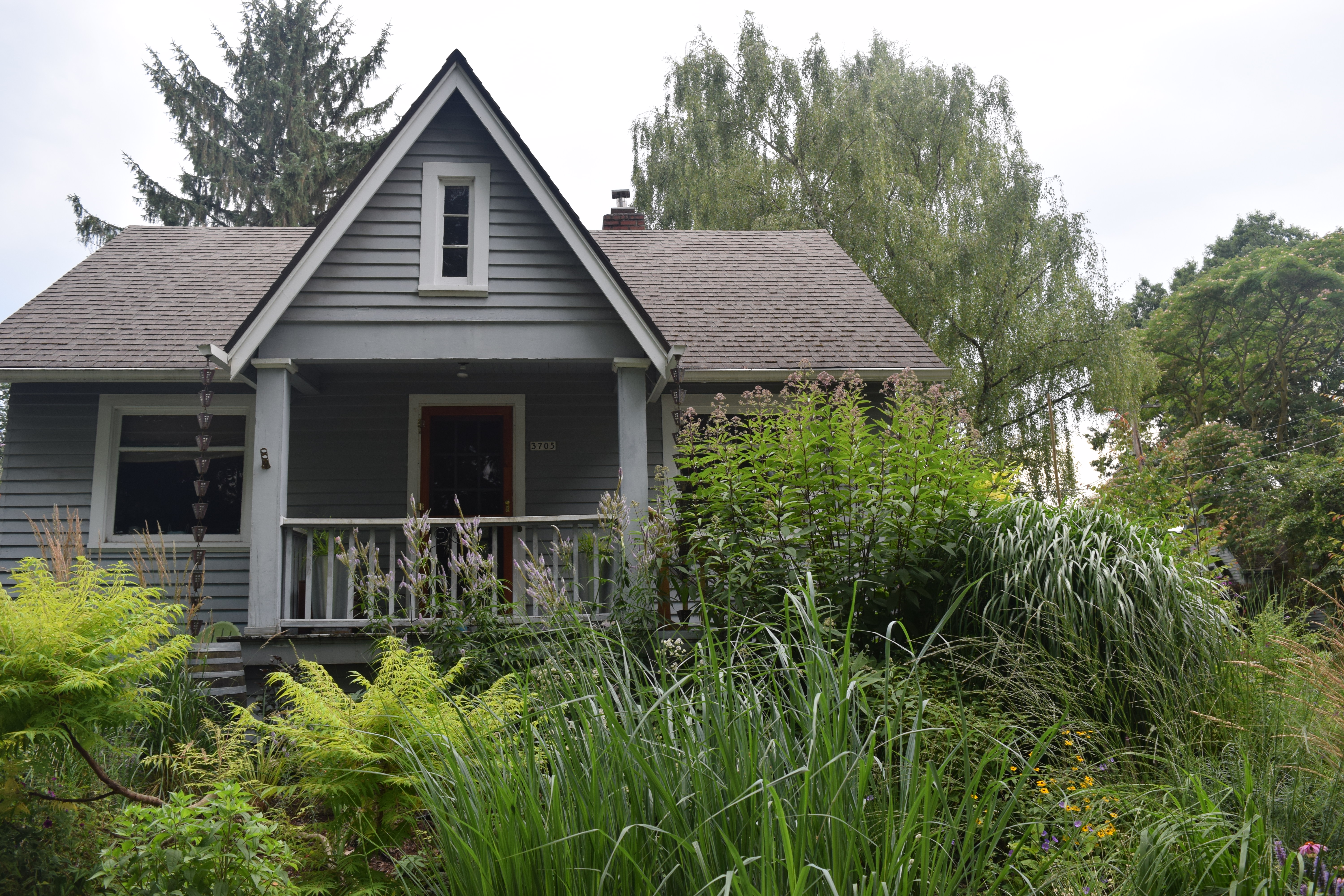 Scott is well known for his love of grasses. His garden has its share of colorful flowers, but your attention is really captured by the rich and varied textures of the grasses, with their movement, varying shades of green, and subtle flowers and seed heads. All this tall grass makes me think of Rhone Street Gardens as the Little House on the Portland Prairie.