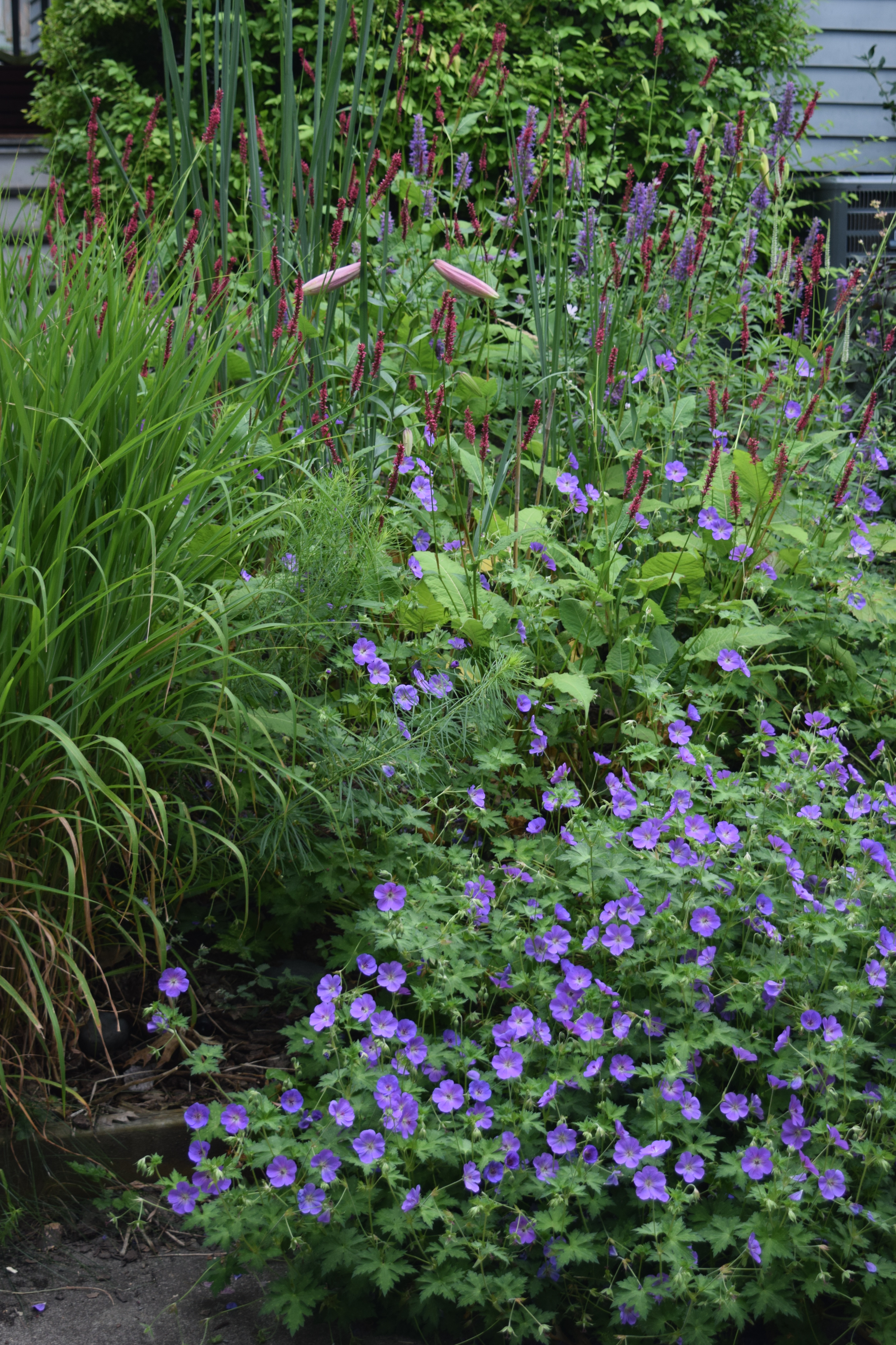 Geranium ‘Rozanne’ and Persicaria. Scott has inspired me to plant more grasses, but his garden also makes me want to acquire some Persicaria. Looks like some Agastache mixed in there also.