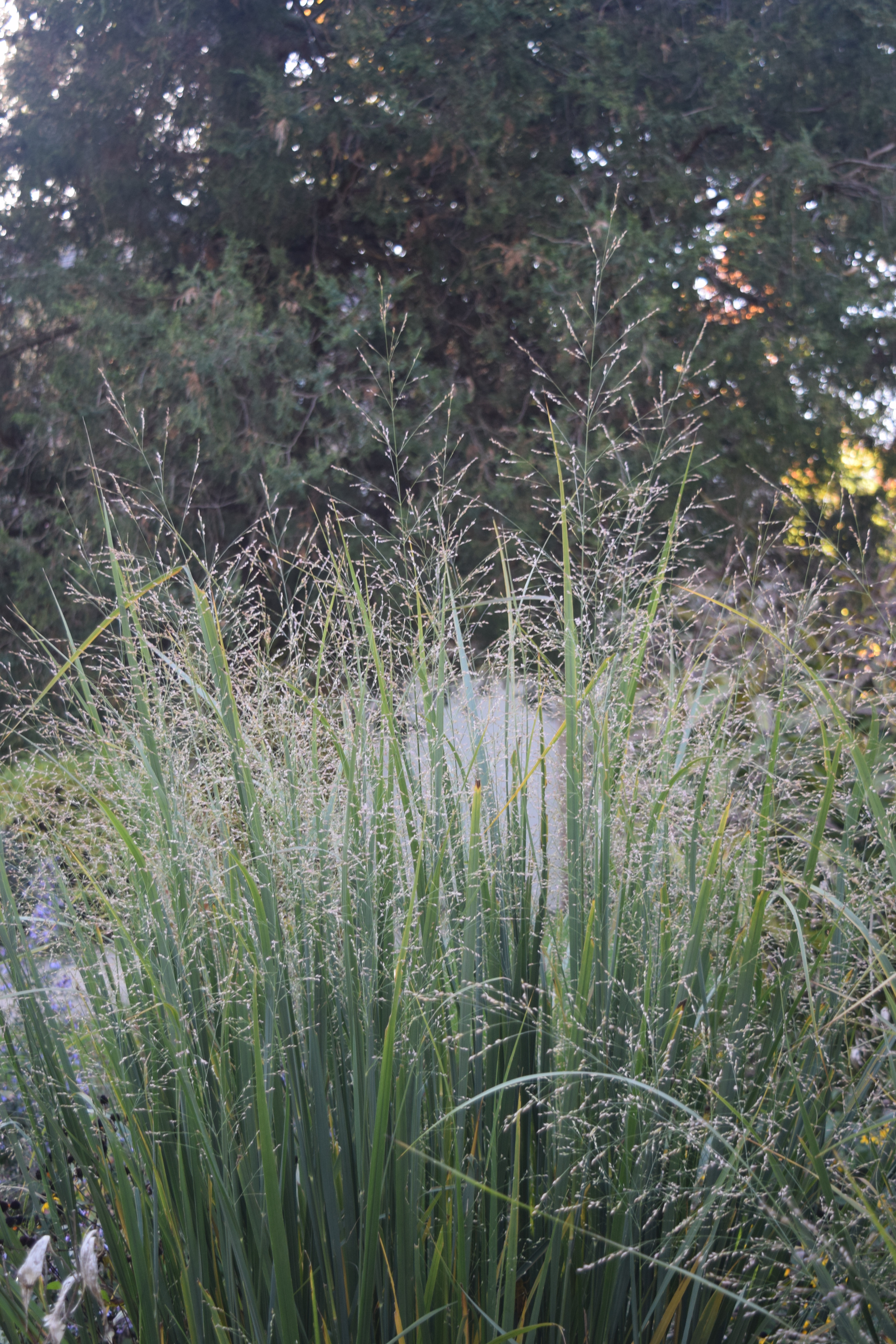 The ‘Northwind’ Switchgrass (Panicum virgatum) is still almost entirely green, though the seed panicles are turning tan.