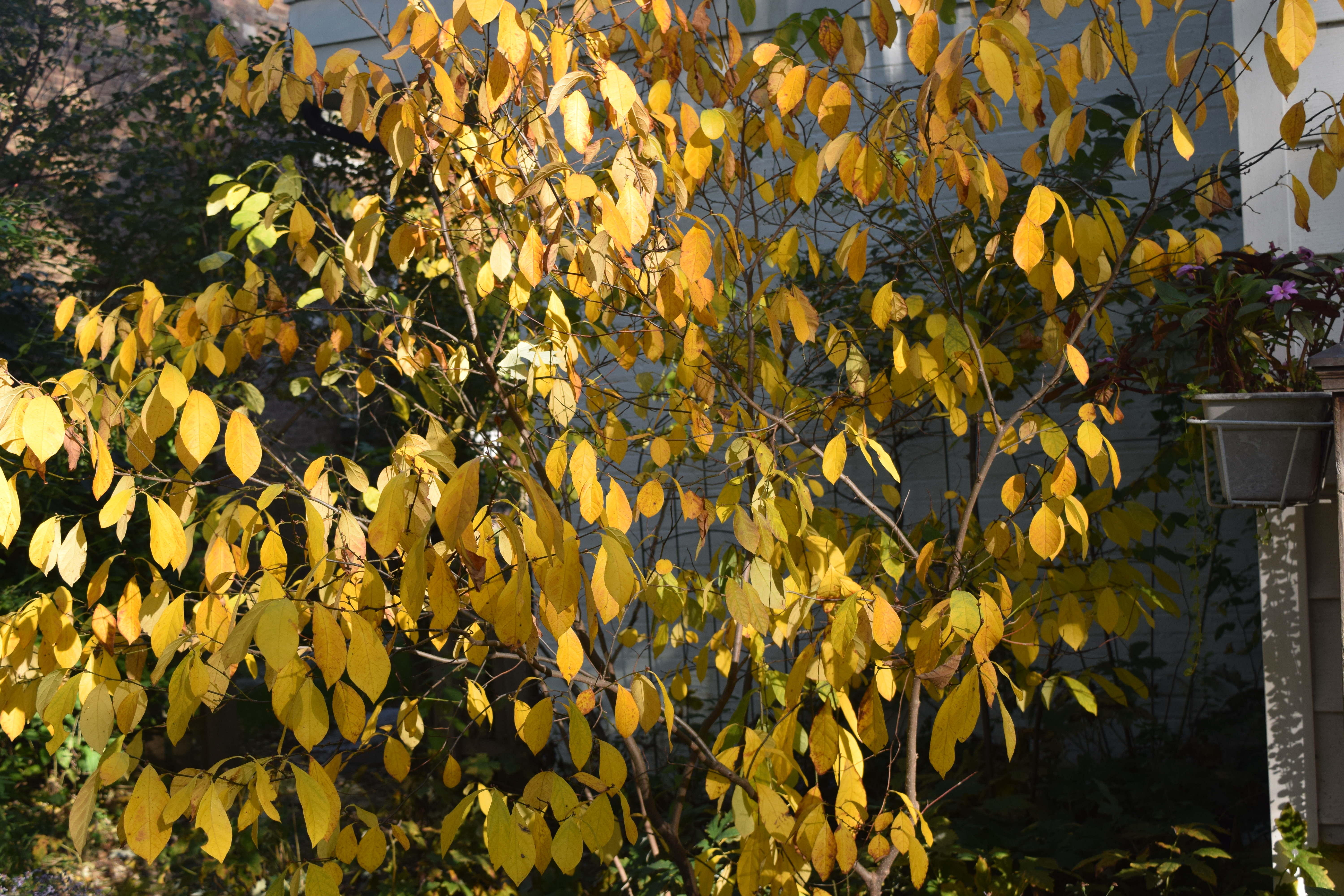 In the back garden, Spicebush (Lindera benzoin) has turned a bright orange-yellow.