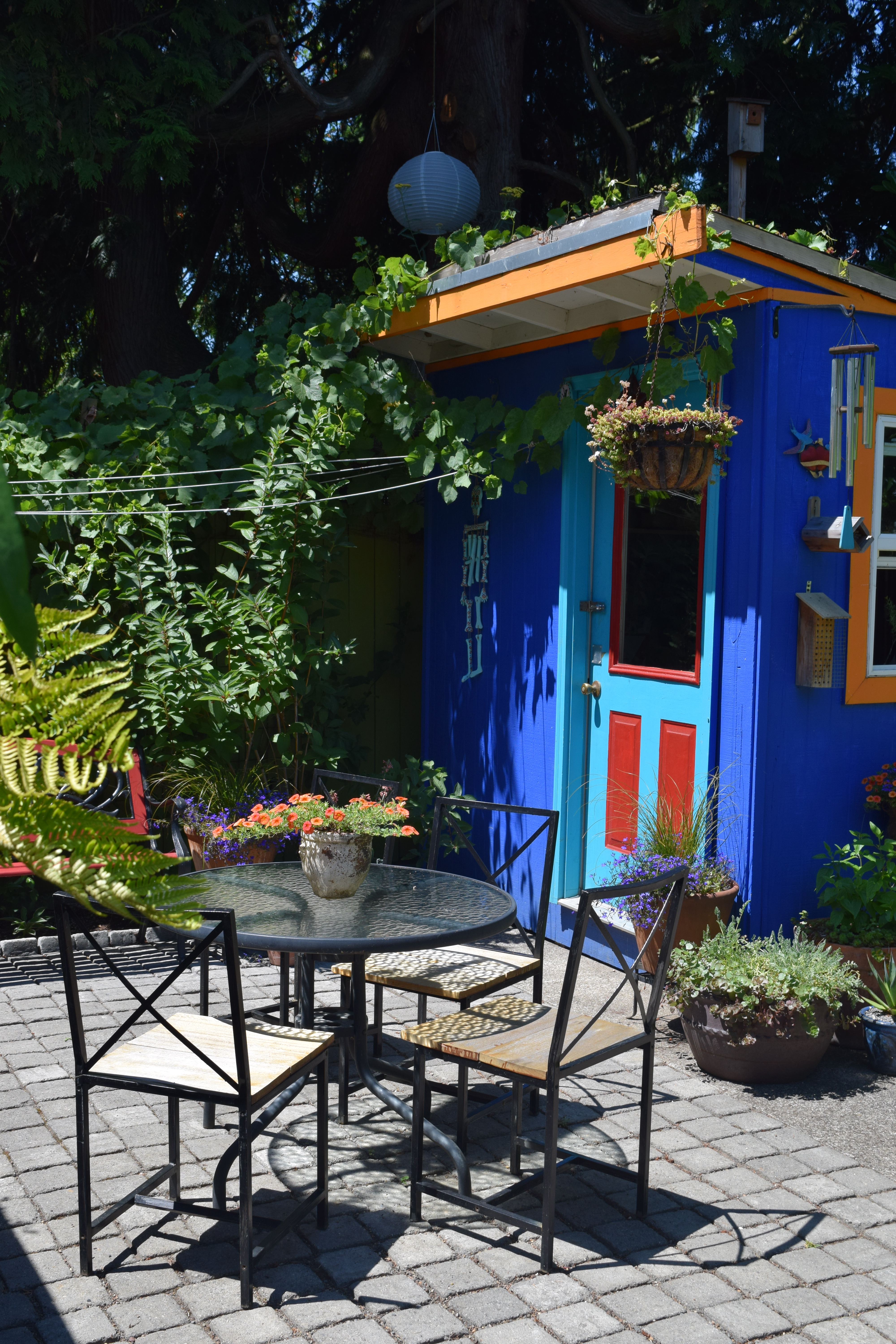The back garden has a sort of courtyard feel. Seeing this garden shed made me want to fly back home and paint my house blue or turquoise.