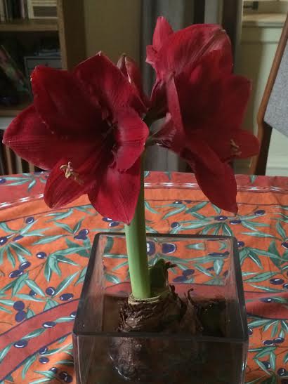 It occurs to me looking at these pictures that one or two Amaryllis really isn’t enough. I wonder if somewhere in the house there’s a wide vase that could hold three or more? or maybe a pot that Judy doesn’t use much?