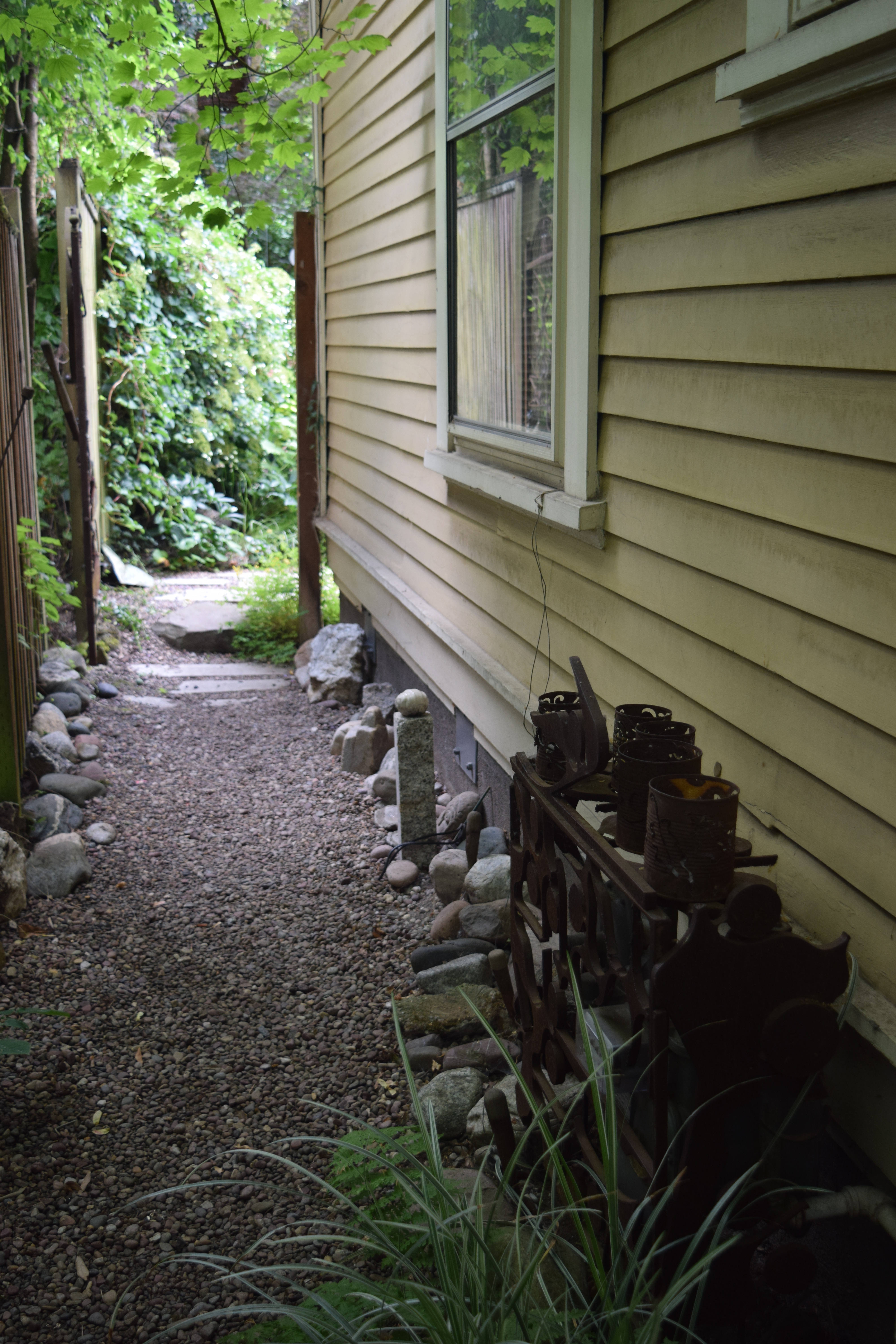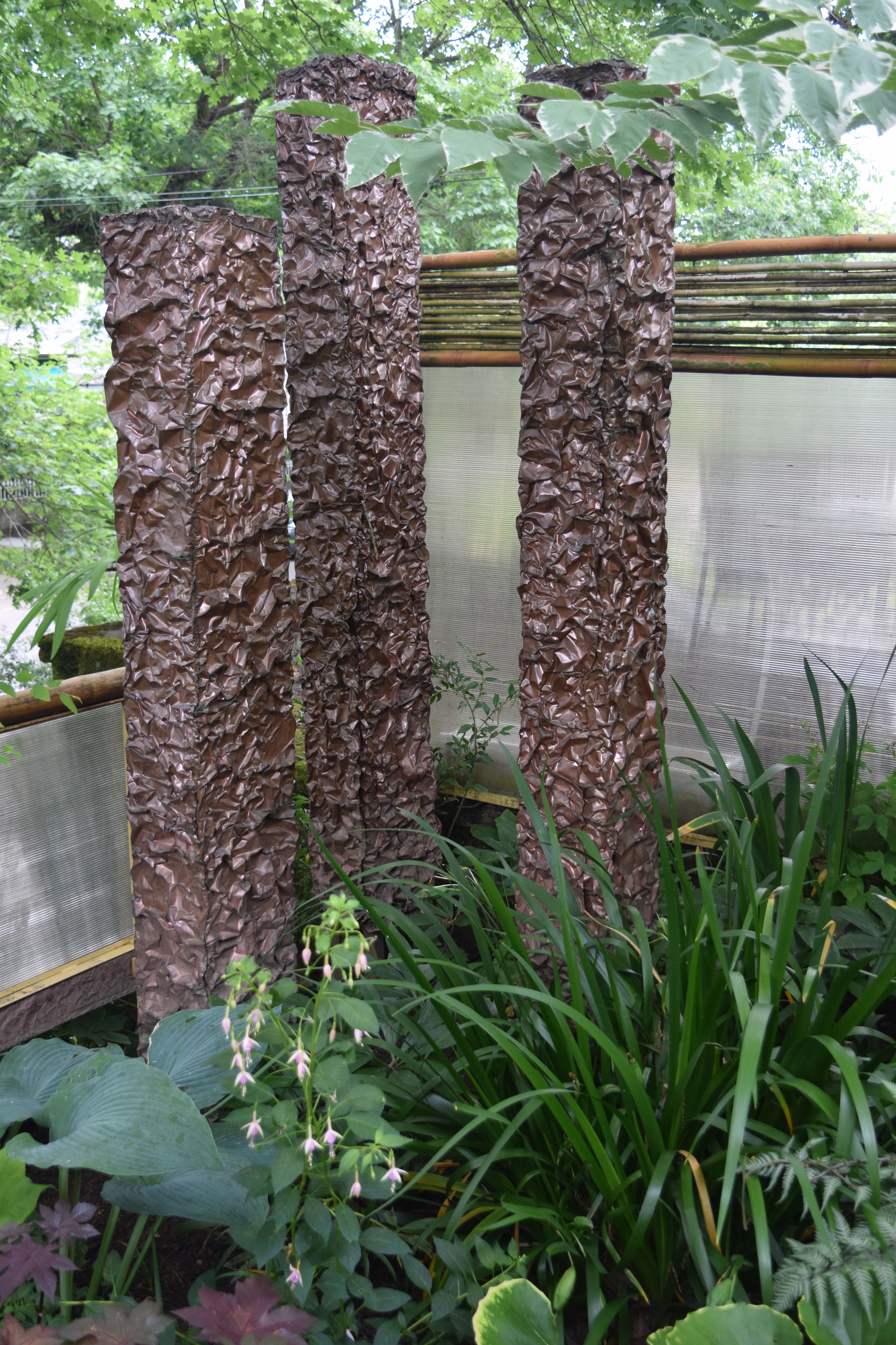 Lots of garden art to be seen, front and back. These textured metal columns are less my style, but to each his own.