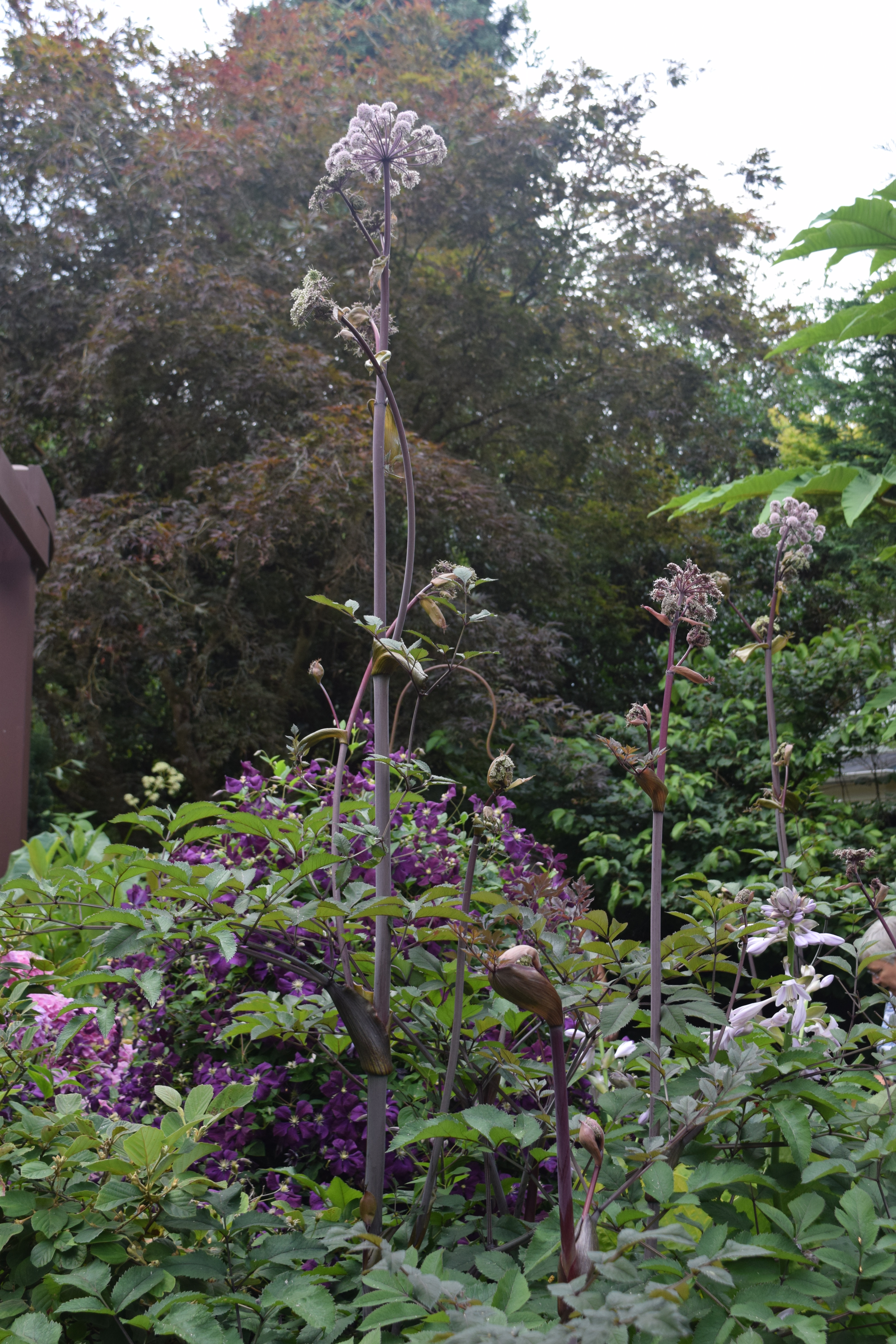 A fellow lover of tall plants! I don’t grow this one, but I think it is some kind of Angelica. Nice Clematis blooming in the background.