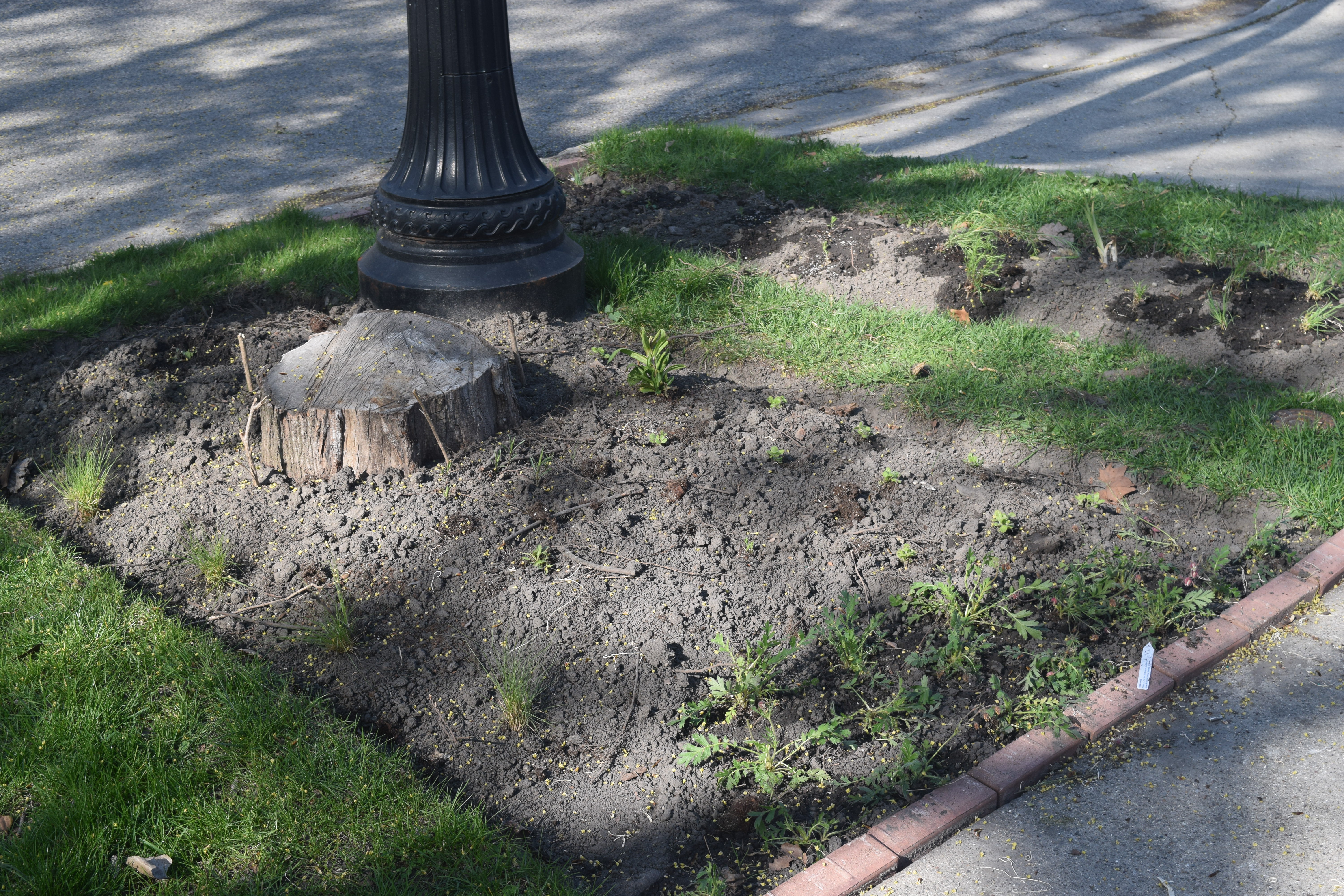 The new parkway border, all planted. The city has told me they won’t remove the stump, so I’m thinking of putting a container on it.