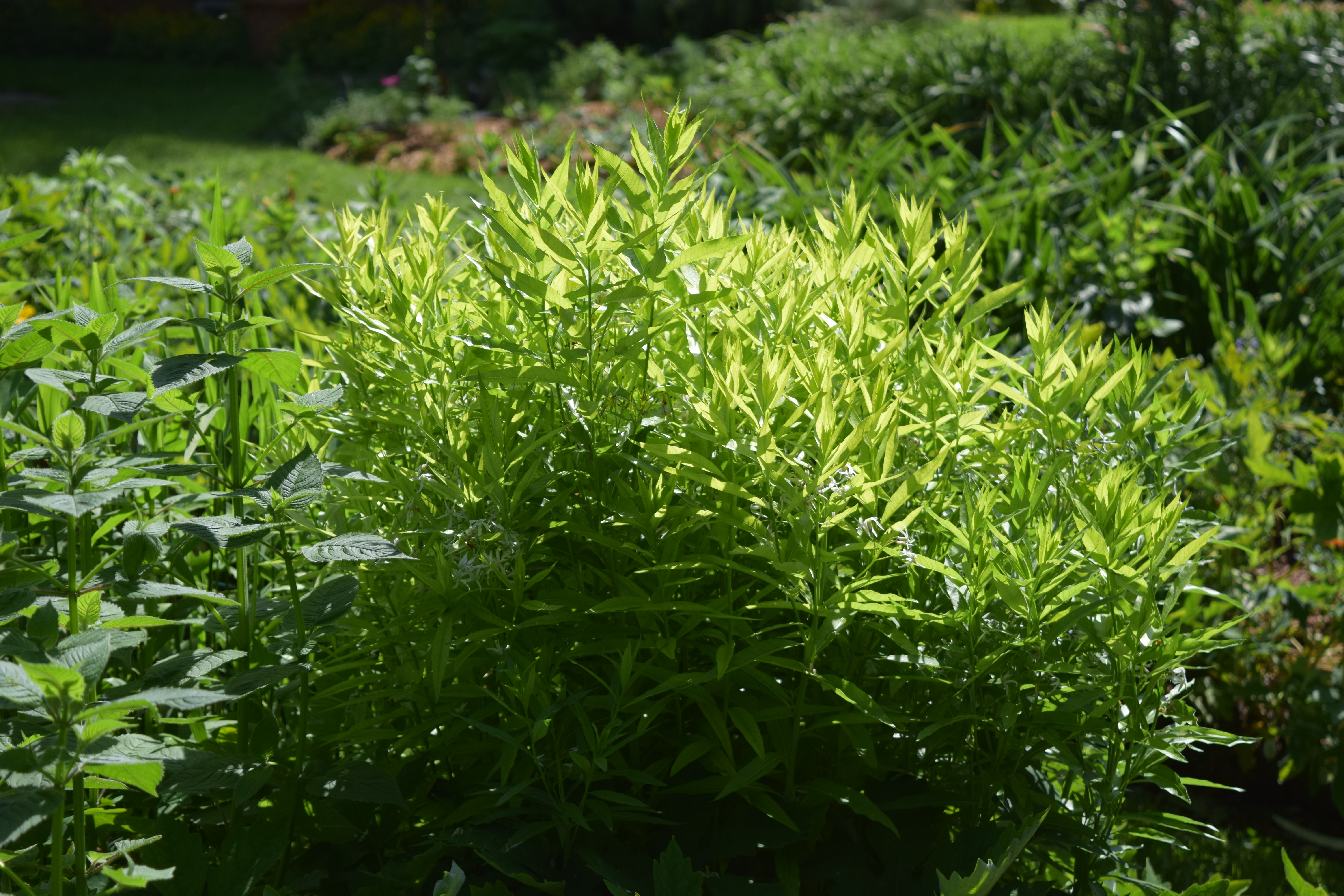The big Bluestar (Amsonia tabernaemontana) in the Sidewalk Border did not bloom much this year, and the new foliage looks almost chartreuse. Nice, but a sign of decline?