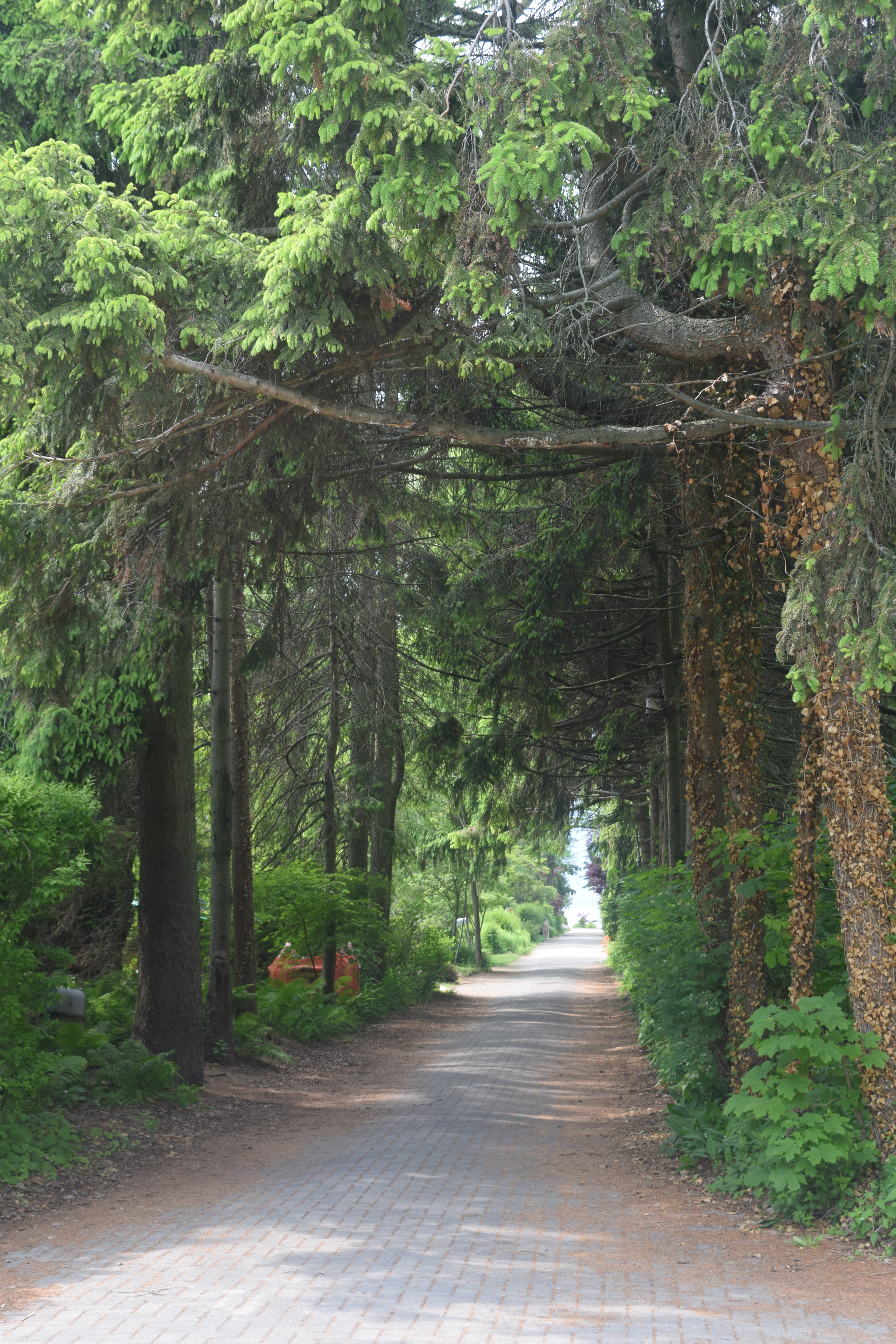 We walked under a canopy formed by tall conifers on either side of a narrow lane.