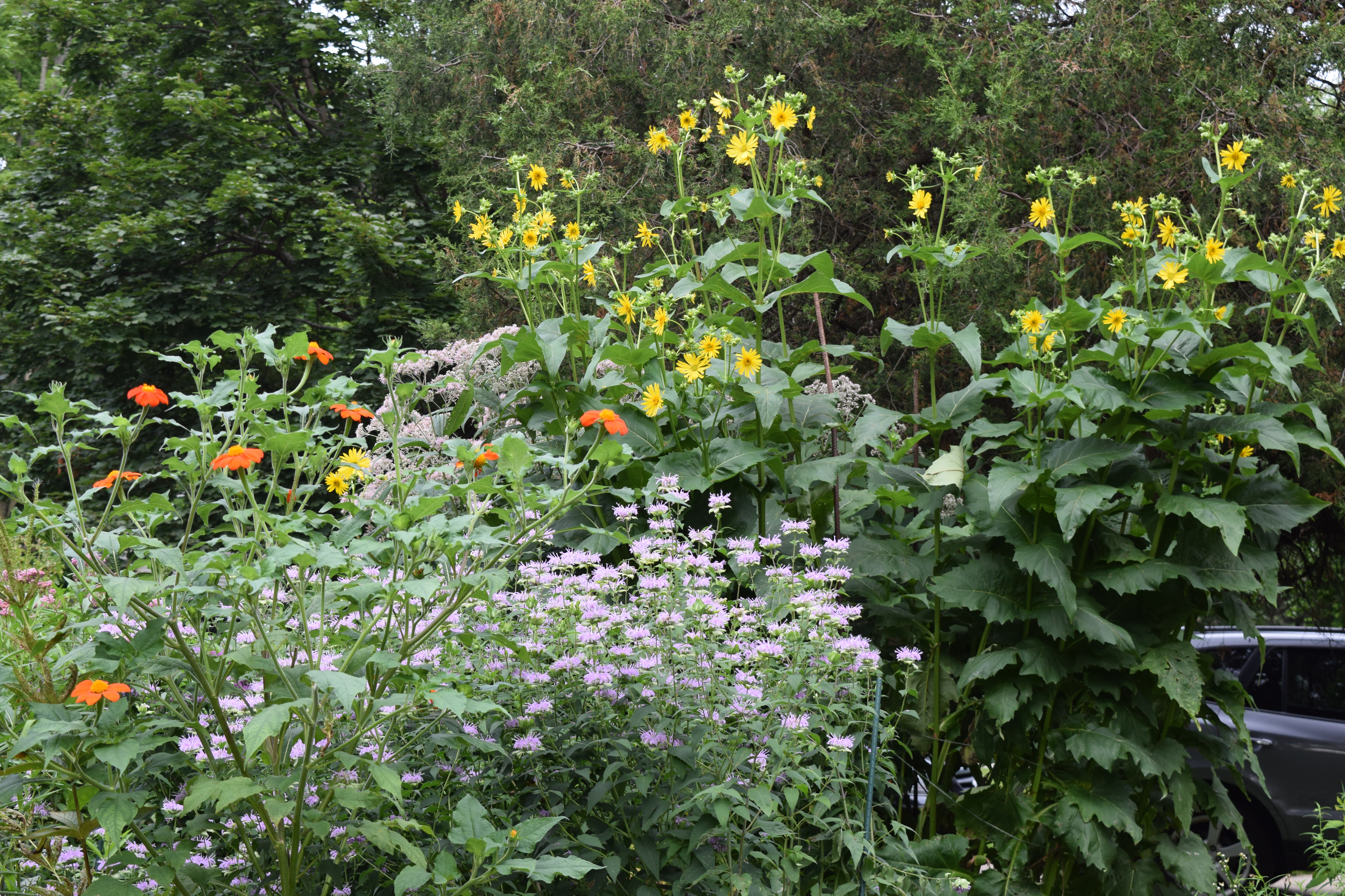 Here you can see the Mexican Sunflower growing tall among its perennial partners.
