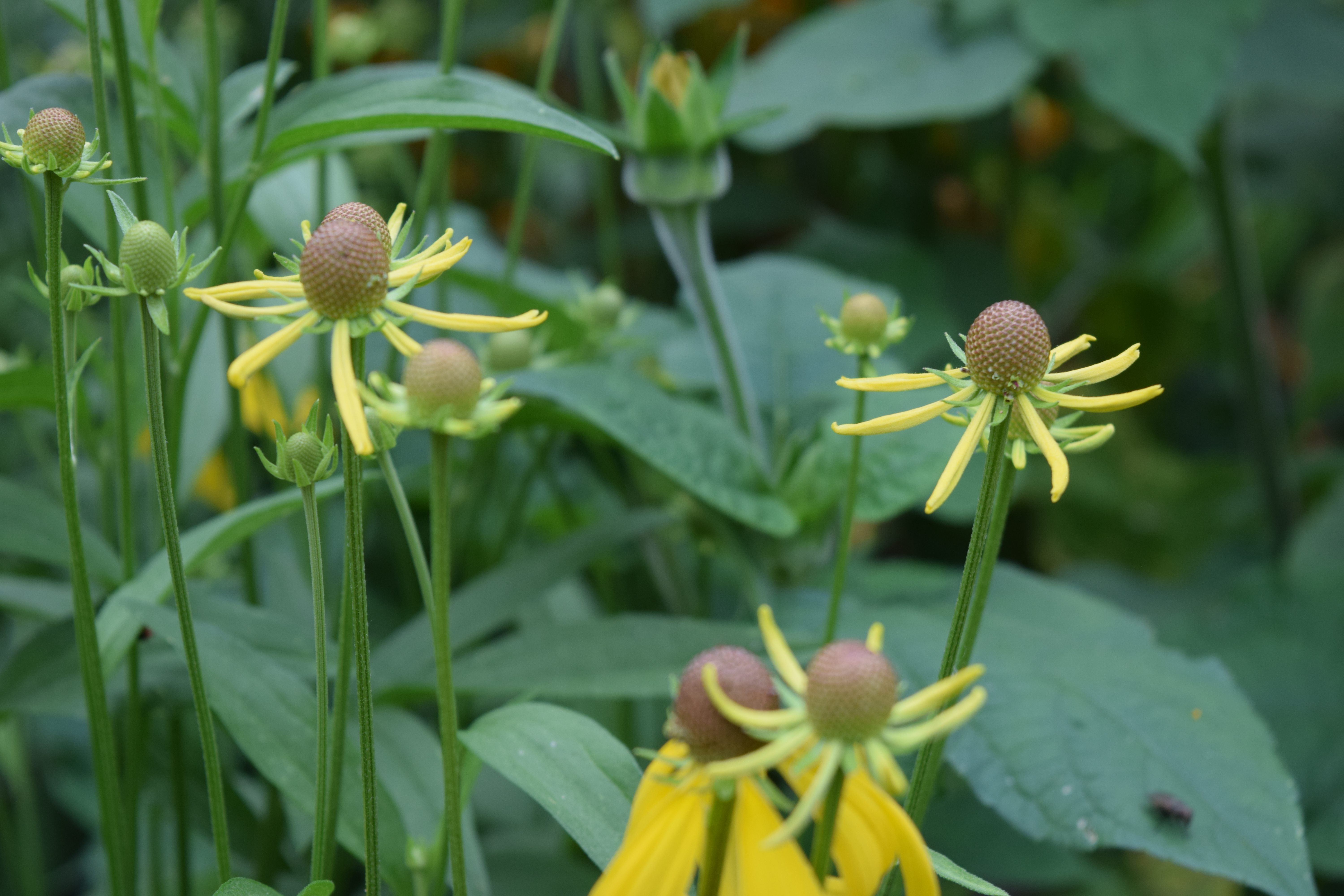 Going back to the Driveway Border, we can find another of my favorite August flowers – Yellow or Grey Headed Coneflower (Ratibida pinnata). These yellow ray flowers are just starting to poke out from around the central disks.