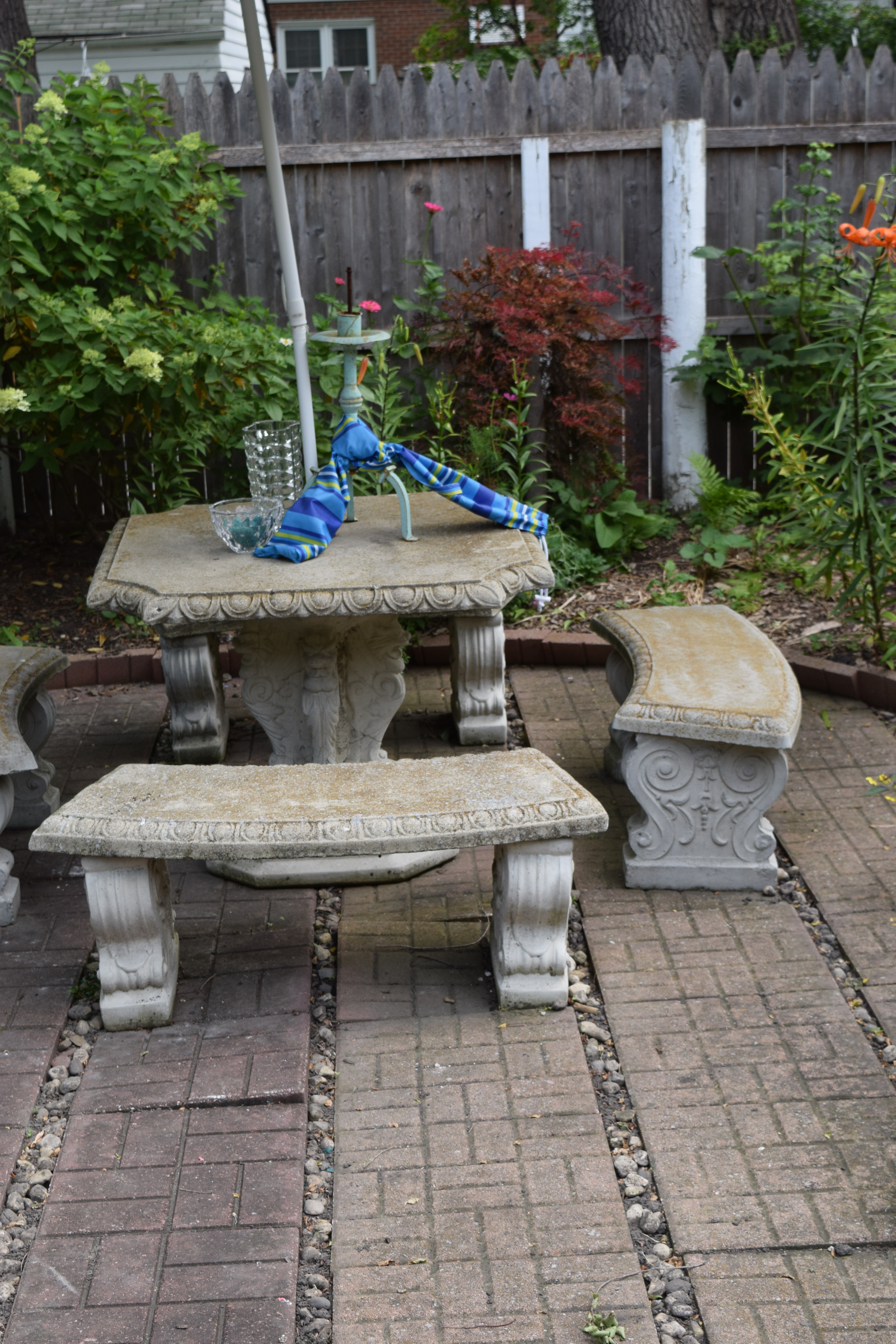 There is a narrow border along all four sides of the front garden, with a concrete bench at each corner. Pavers fill in the area between the beds.