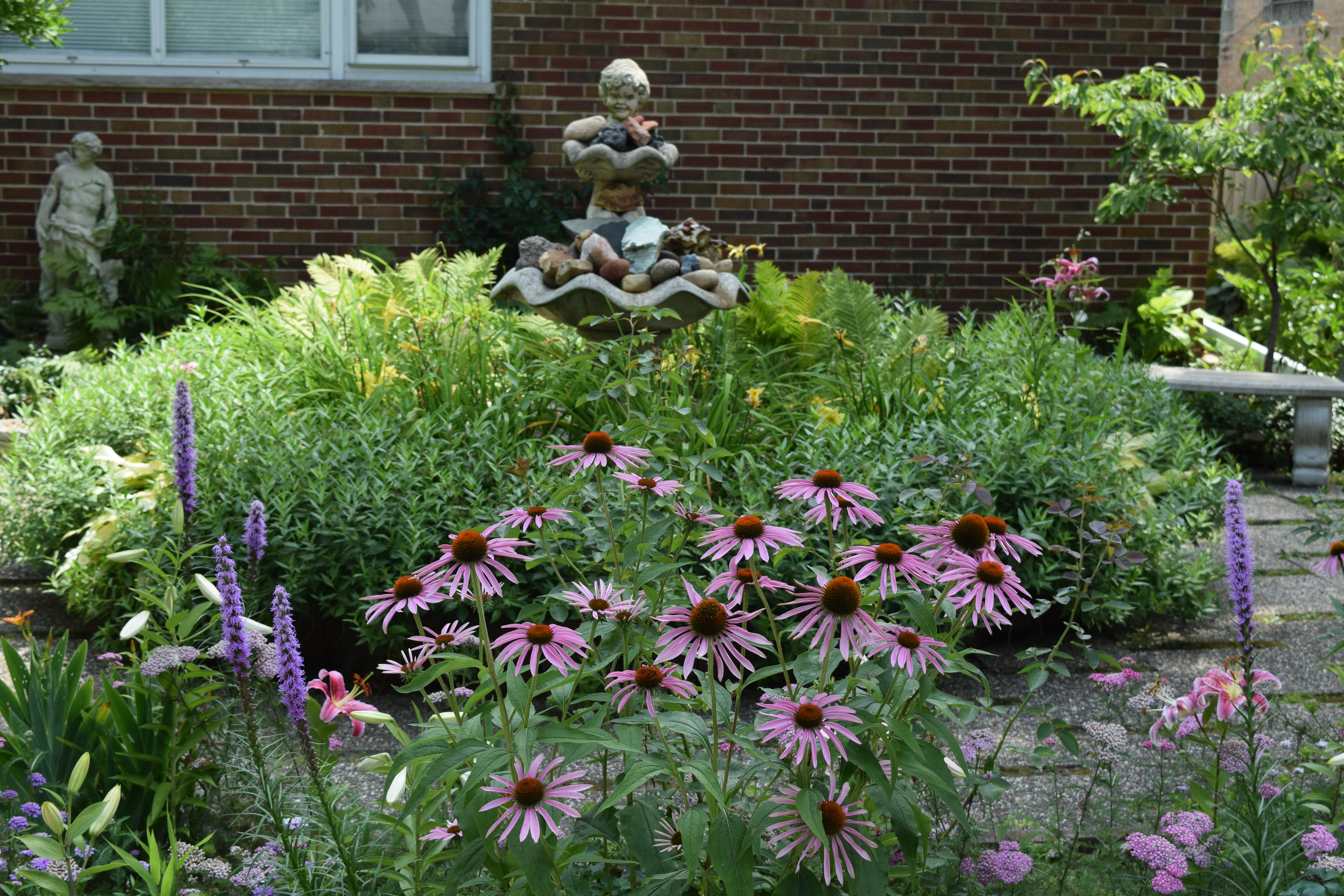 Another aspect of Veronica’s garden that I could relate to was the mix of exotics and native wildflowers. For instance, there were both Common (Asclepias syriaca) and Swamp Milkweed (A. incarnata), and sure enough, Monarch butterflies were making themselves at home. Purple Coneflowers (Echinacea purpurea) are also plentiful.