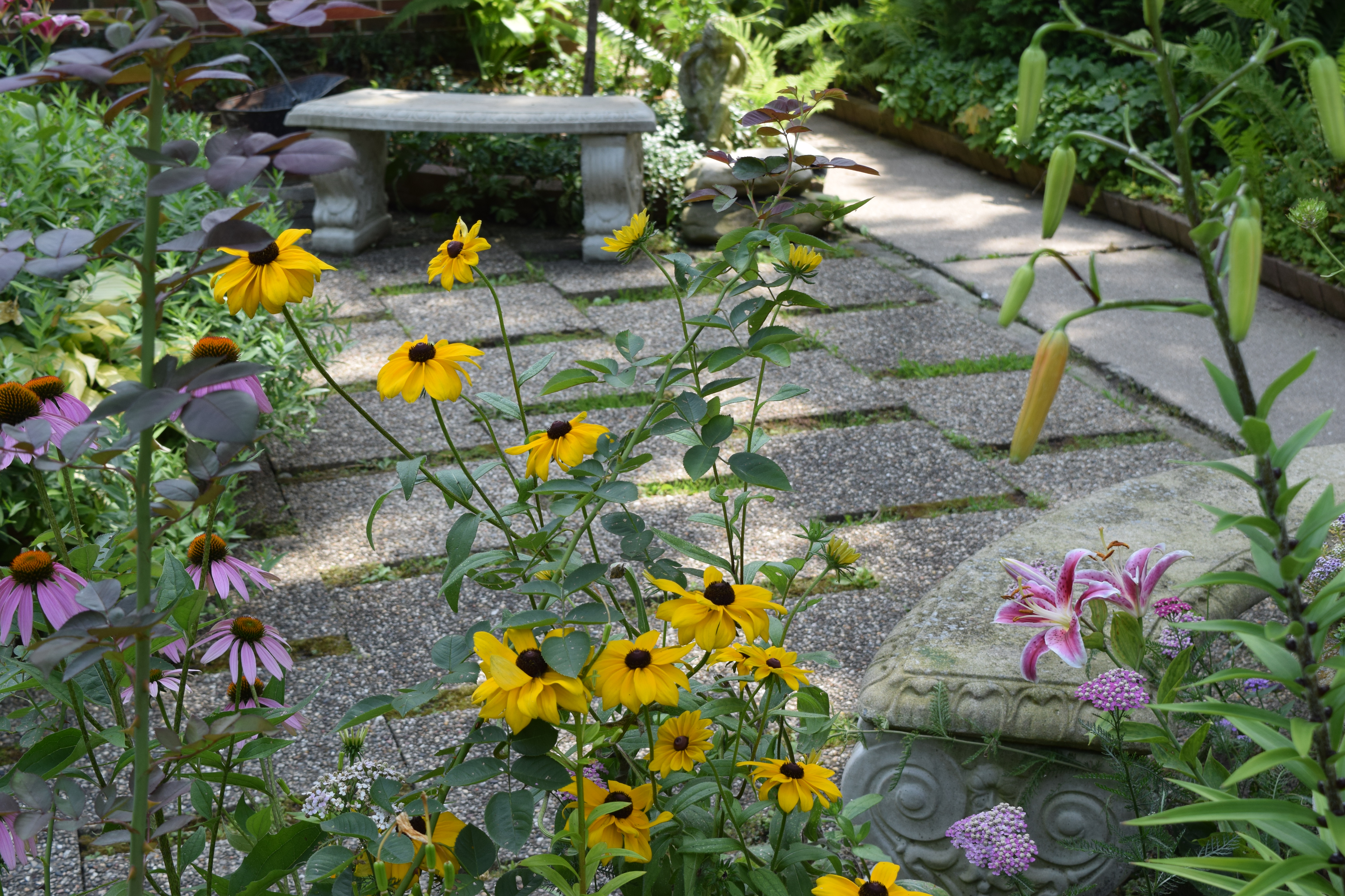 Not being a fan of concrete I still really really want my own clamshell seat. Even with all the awesome lilies and other blooms… and the interesting placement of the pavers (I like the pattern of gaps for moss), it’s the clamshell I keep coming back to 🙂
