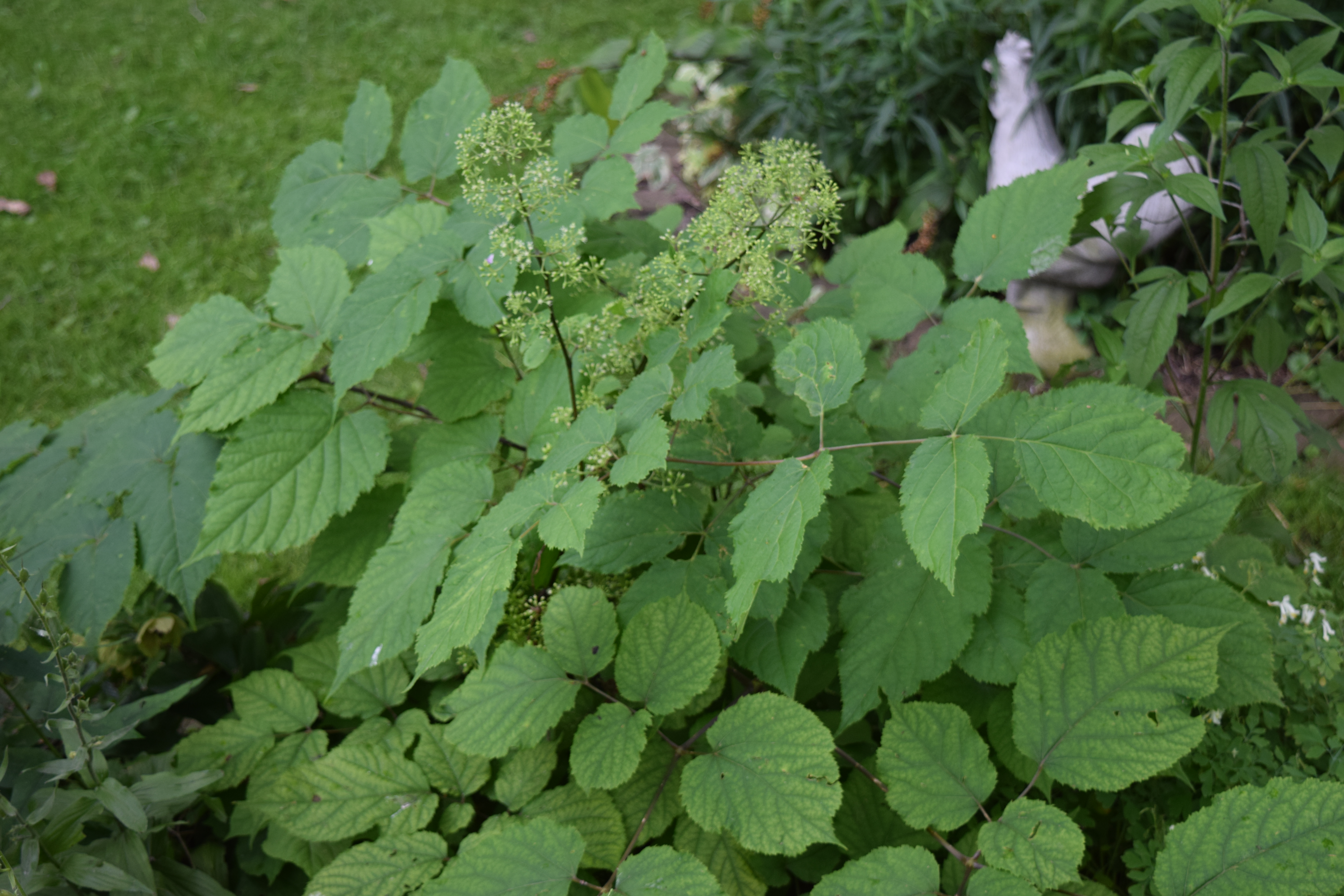 American Spikenard has been growing in my garden for two summers and so far I am pleased with it. It is a big plant growing up to 5′ tall, though mine is under 3′ this year. It has dark stems and bold, heart-shaped leaflets.