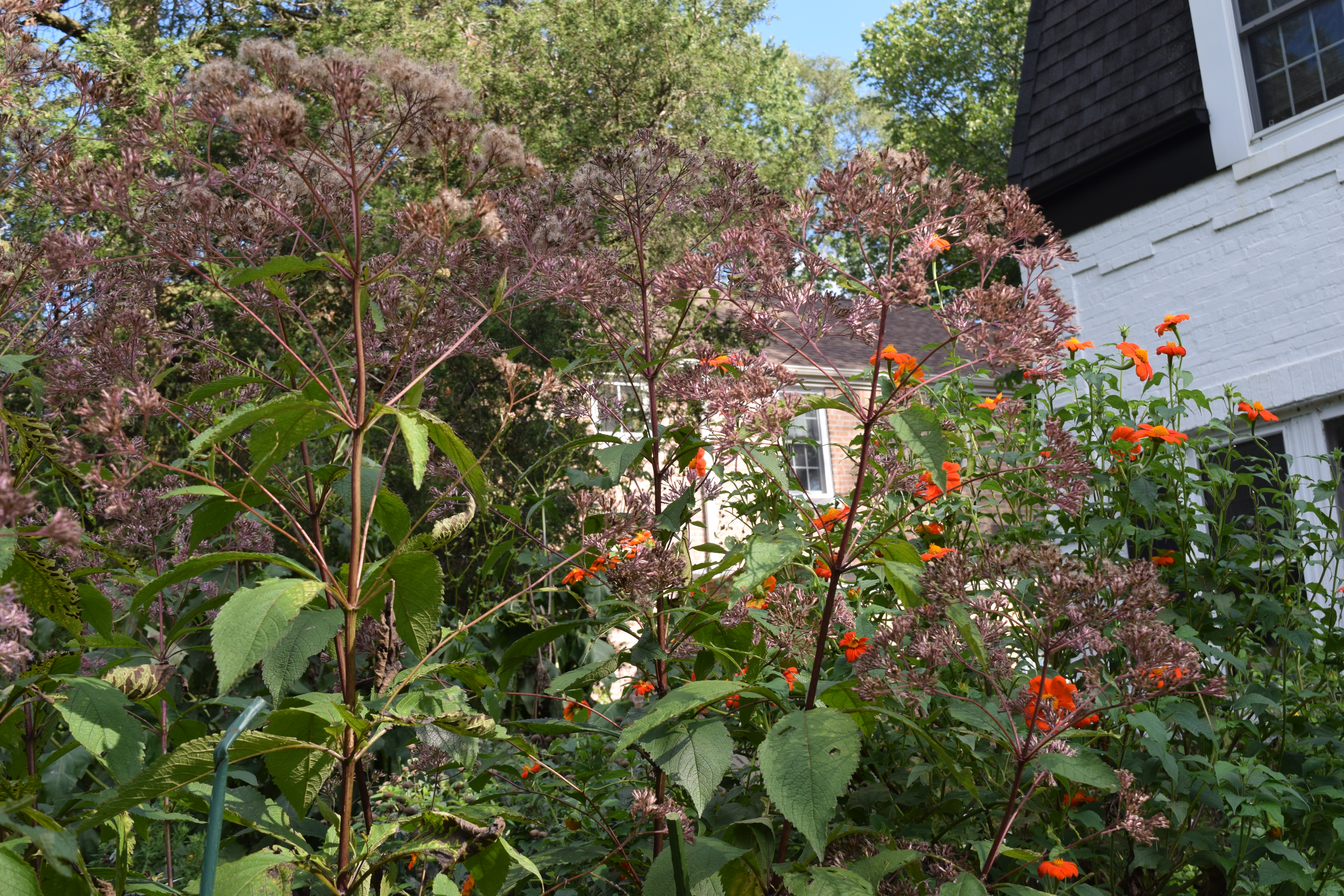 A big clump of ‘Gateway’ Joe Pye Weed (Eutrochium maculatum) stands between two Mexican Sunflowers. E. maculatum flowers last much longer into the season than Sweet Joe Pye Weed (E. purpureum). They also have nice purple stems.