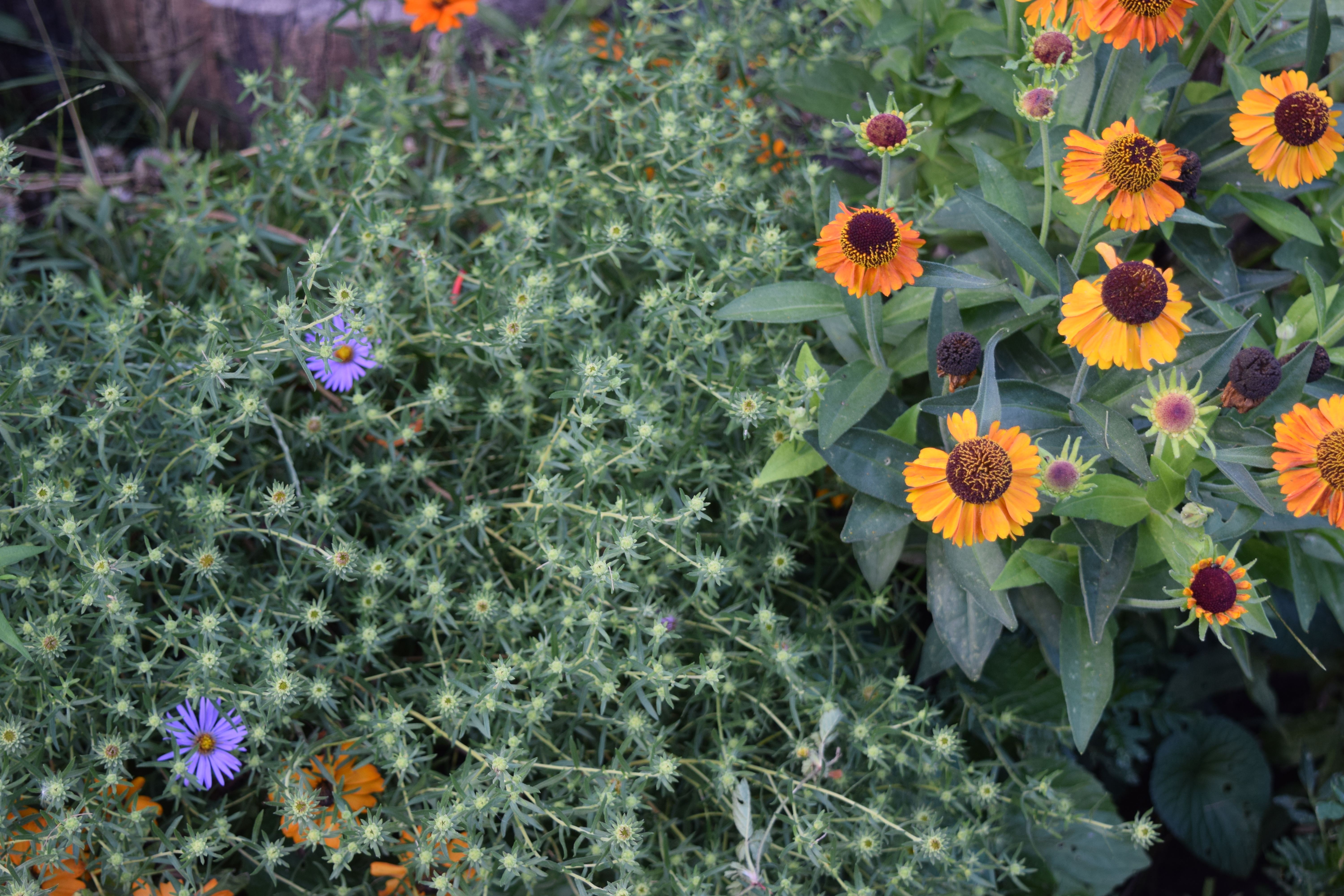 On the other side of the driveway, in the Lamppost Bed, Helenium autumnale ‘Short’n’Sassy’ has been blooming since June. I’m beginning to worry it’s going to be so exhausted soon it won’t survive the winter. Aromatic Aster (Symphyotrichum oblongifolium) is cozying up to the Helenium, but just a handful of buds have actually opened. Soon, though, it will be covered in flowers.