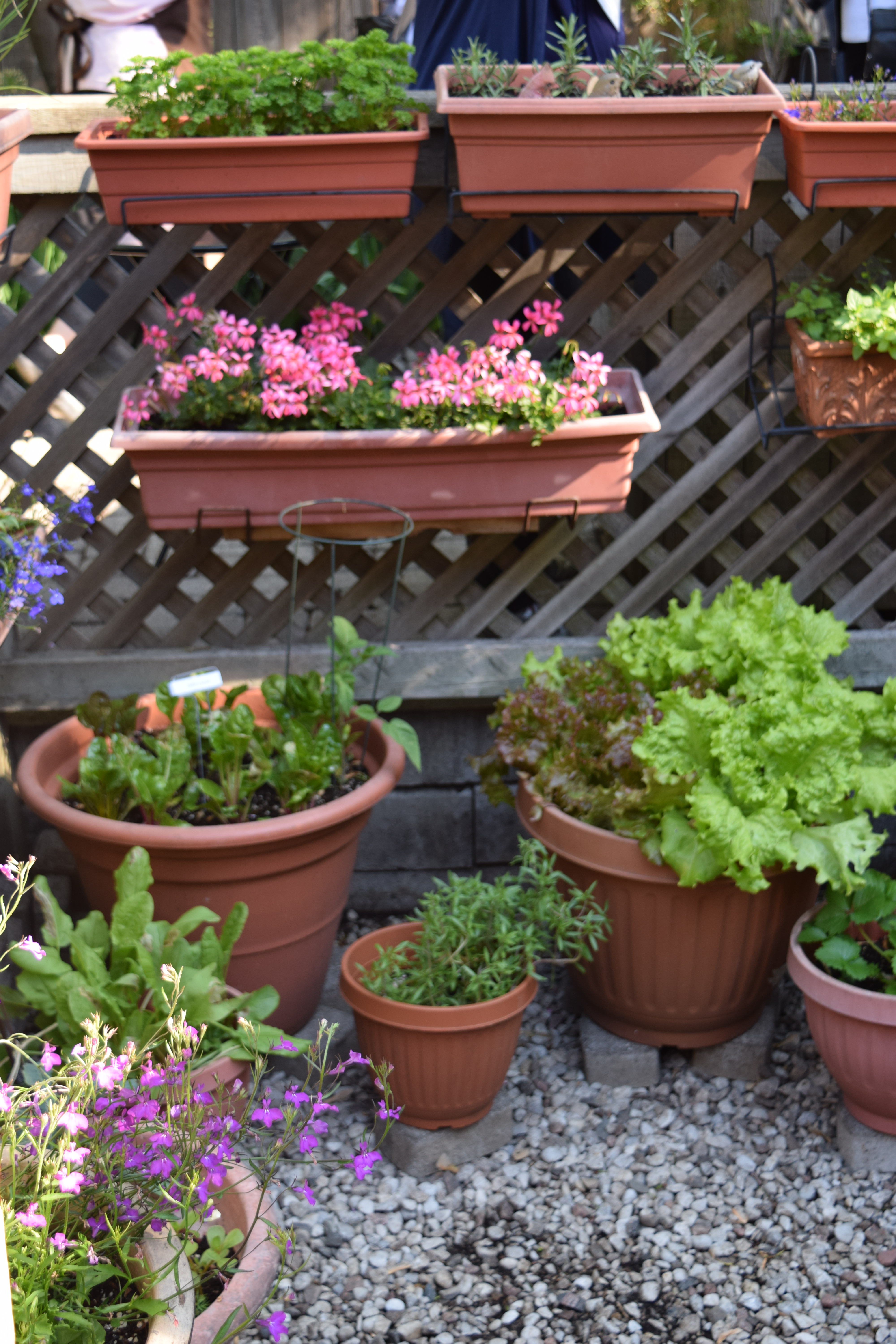 4. It is impressive what gardeners can do with just a little space! I love that easel showcasing the plants, too – great idea! There so many pretty vertical accents. I like the various balls and dragonflies that float along the top of the plant border.