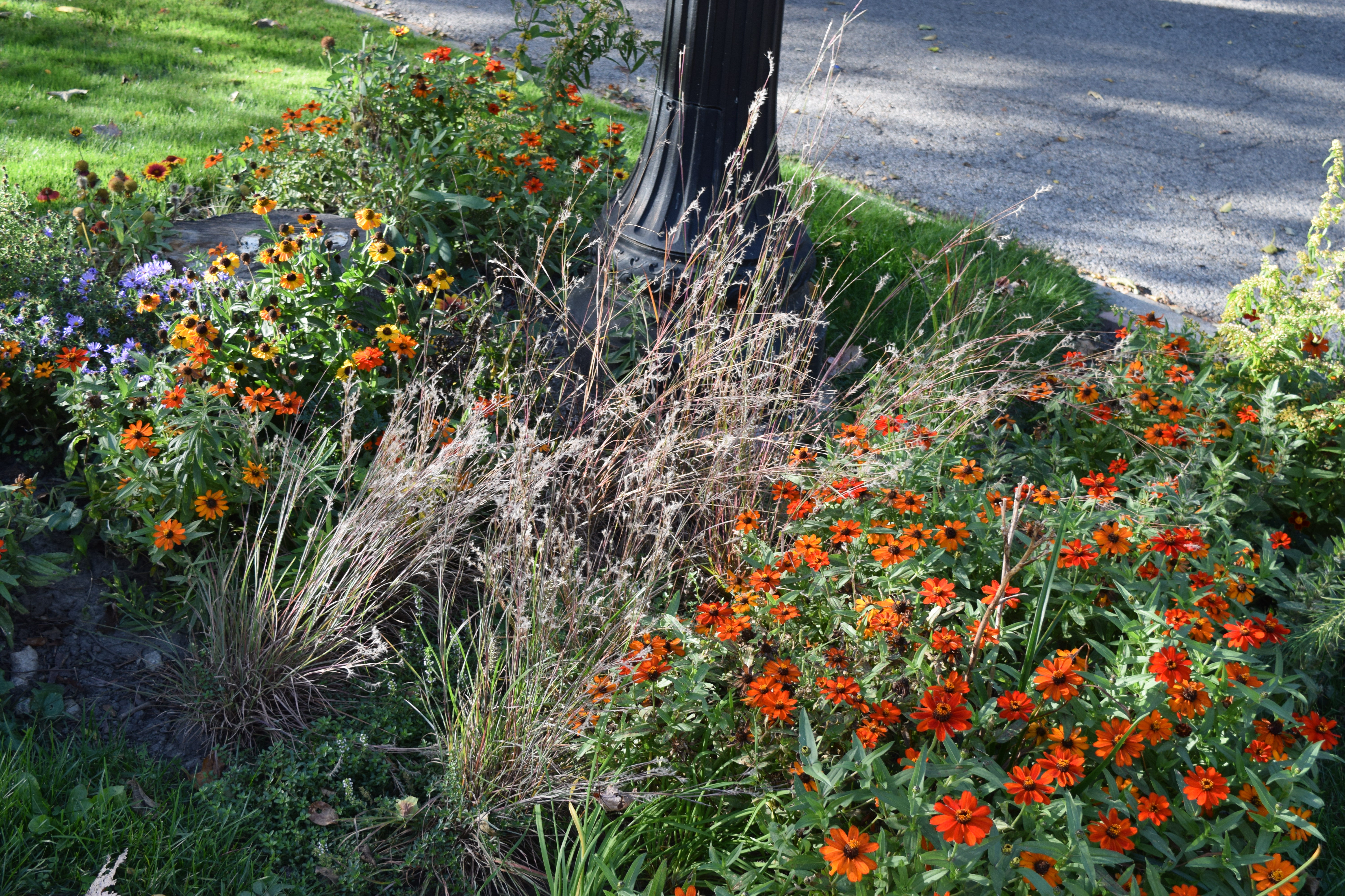 As long as I don’t look too closely, I am really pleased with how this Lamppost bed has turned out this year. If I do look closely, I am appalled by all the weeds hiding among the new perennials. Fortunately the Zinnia elegans ‘Profusion Fire’ provides lots of distraction.