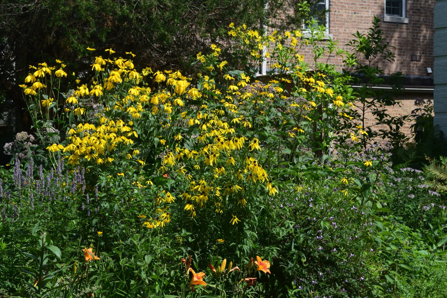 And here’s a picture taken from the sidewalk. This makes it more clear that the Yellow Coneflower and Cutleaf Coneflower are in the Driveway Border, while the Cup Plant stands at the back of the Front Island Bed.