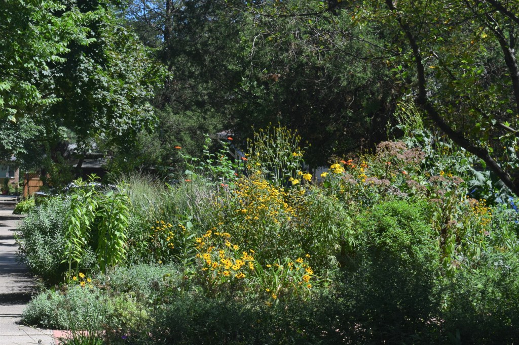 According to the National Drought Mitigation Center’s Drought Monitor, our area has gone from Abnormally Dry to Moderate Drought. In the Parkway Bed the Orange Coneflowers (Rudbeckia fulgida) and Brown-Eyed Susans (R. triloba) are definitely droopy, and some of their flowers are crinkling up. they look better. Moisture lovers, the Monardas and Joe Pye Weeds, are looking distinctly fatigued.