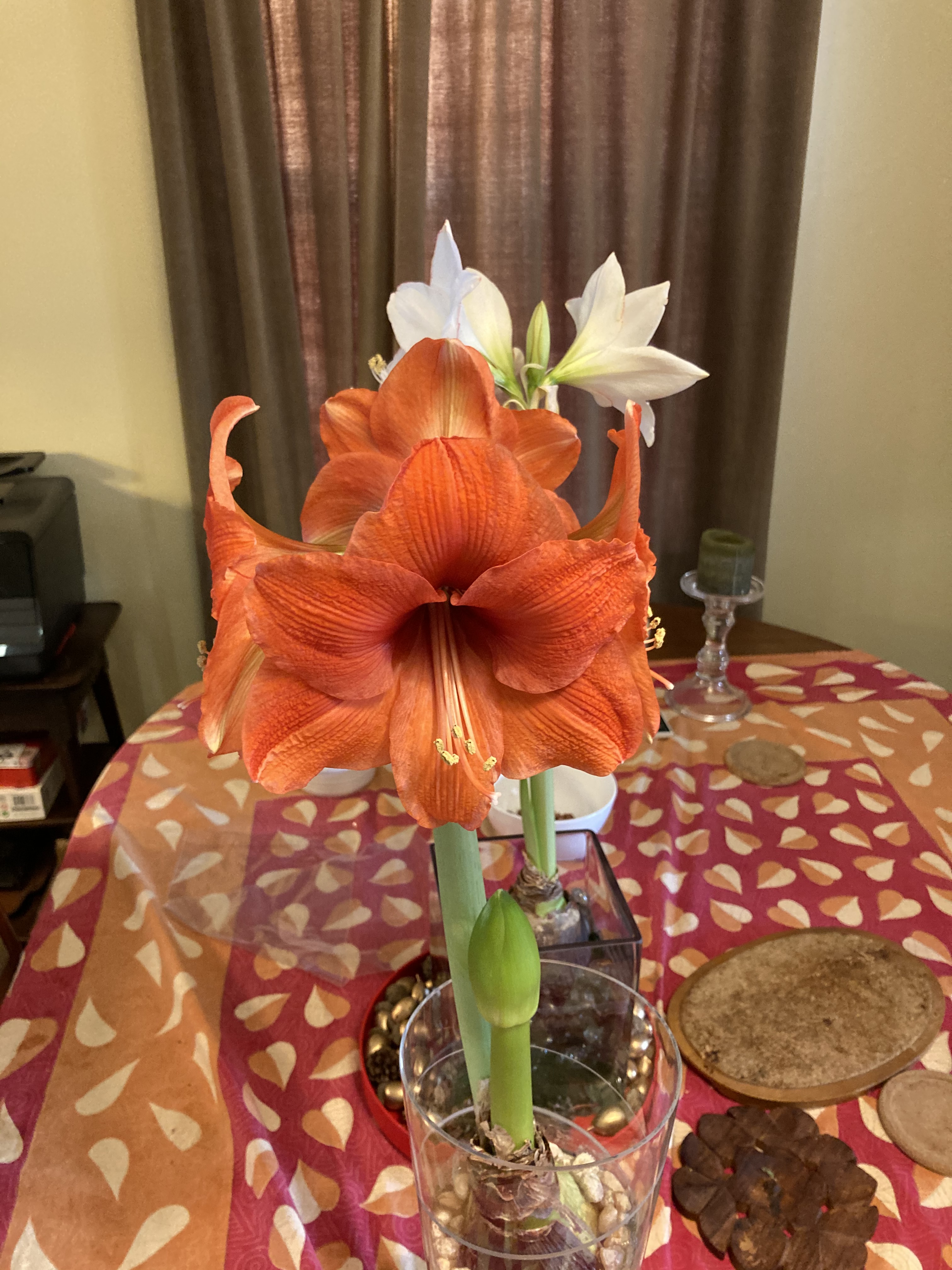The second Hippeastrum to bloom was ‘Picotee’. At least, I’m pretty sure it was ‘Picotee’. We are also growing a third variety called ‘Picasso’, which looks just like ‘Picotee’ but it’s supposed to be fragrant. ‘Picasso’ still has a few days to go, it seems.