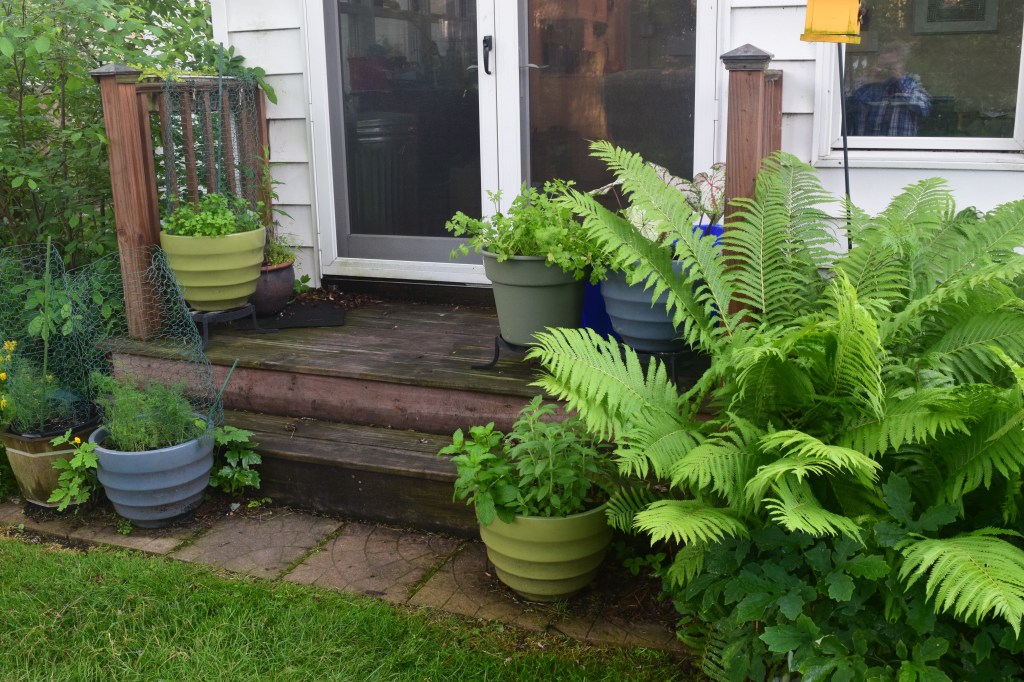 Dill, Parsley, Cilantro and Mint growing in pots on the back porch steps. Mint manages to live through winters right in the container, so there’s never a need to replant.