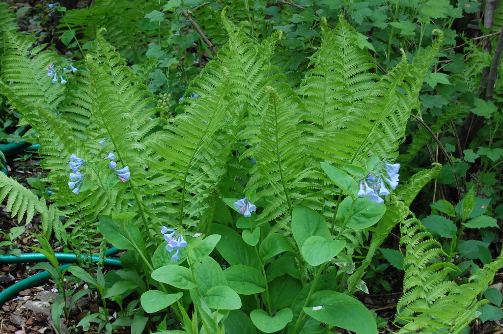 Most years the Ostich ferns don’t unfurl until the VA bluebells are about done, some years they are earlier.